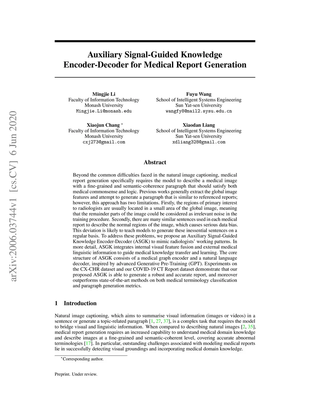 Beyond the common difficulties faced in the natural image captioning, medical report generation specifically requires the model to describe a medical image with a fine-grained and semantic-coherence paragraph that should satisfy both medical commonsense and logic. Previous works generally extract the global image features and attempt to generate a paragraph that is similar to referenced reports; however, this approach has two limitations. Firstly, the regions of primary interest to radiologists are usually located in a small area of the global image, meaning that the remainder parts of the image could be considered as irrelevant noise in the training procedure. Secondly, there are many similar sentences used in each medical report to describe the normal regions of the image, which causes serious data bias. This deviation is likely to teach models to generate these inessential sentences on a regular basis. To address these problems, we propose an Auxiliary Signal-Guided Knowledge Encoder-Decoder (ASGK) to mimic radiologists' working patterns. In more detail, ASGK integrates internal visual feature fusion and external medical linguistic information to guide medical knowledge transfer and learning. The core structure of ASGK consists of a medical graph encoder and a natural language decoder, inspired by advanced Generative Pre-Training (GPT). Experiments on the CX-CHR dataset and our COVID-19 CT Report dataset demonstrate that our proposed ASGK is able to generate a robust and accurate report, and moreover outperforms state-of-the-art methods on both medical terminology classification and paragraph generation metrics.