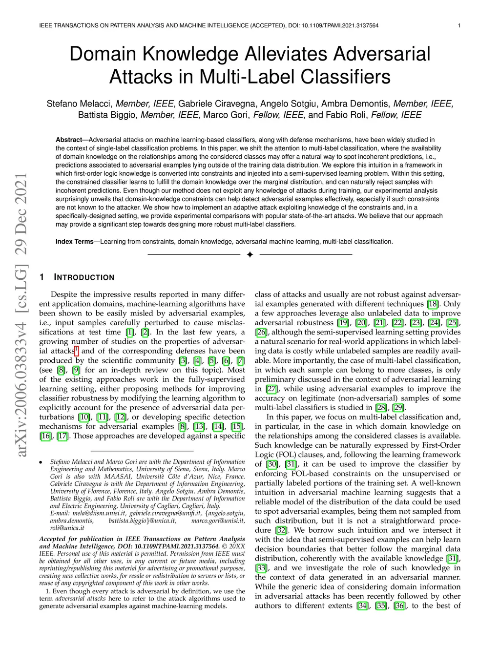 Adversarial attacks on machine learning-based classifiers, along with defense mechanisms, have been widely studied in the context of single-label classification problems. In this paper, we shift the attention to multi-label classification, where the availability of domain knowledge on the relationships among the considered classes may offer a natural way to spot incoherent predictions, i.e., predictions associated to adversarial examples lying outside of the training data distribution. We explore this intuition in a framework in which first-order logic knowledge is converted into constraints and injected into a semi-supervised learning problem. Within this setting, the constrained classifier learns to fulfill the domain knowledge over the marginal distribution, and can naturally reject samples with incoherent predictions. Even though our method does not exploit any knowledge of attacks during training, our experimental analysis surprisingly unveils that domain-knowledge constraints can help detect adversarial examples effectively, especially if such constraints are not known to the attacker.