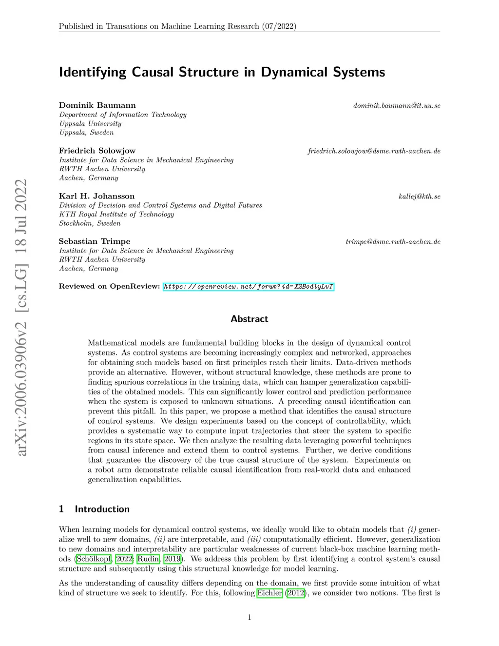 Mathematical models are fundamental building blocks in the design of dynamical control systems. As control systems are becoming increasingly complex and networked, approaches for obtaining such models based on first principles reach their limits. Data-driven methods provide an alternative. However, without structural knowledge, these methods are prone to finding spurious correlations in the training data, which can hamper generalization capabilities of the obtained models. This can significantly lower control and prediction performance when the system is exposed to unknown situations. A preceding causal identification can prevent this pitfall. In this paper, we propose a method that identifies the causal structure of control systems. We design experiments based on the concept of controllability, which provides a systematic way to compute input trajectories that steer the system to specific regions in its state space. We then analyze the resulting data leveraging powerful techniques from causal inference and extend them to control systems. Further, we derive conditions that guarantee the discovery of the true causal structure of the system. Experiments on a robot arm demonstrate reliable causal identification from real-world data and enhanced generalization capabilities.