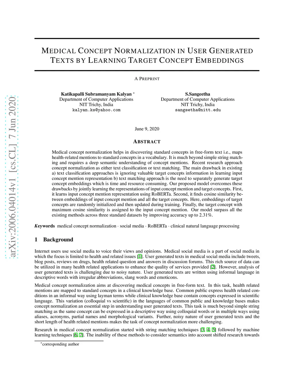 Medical concept normalization helps in discovering standard concepts in free-form text i.e., maps health-related mentions to standard concepts in a vocabulary. It is much beyond simple string matching and requires a deep semantic understanding of concept mentions. Recent research approach concept normalization as either text classification or text matching. The main drawback in existing a) text classification approaches is ignoring valuable target concepts information in learning input concept mention representation b) text matching approach is the need to separately generate target concept embeddings which is time and resource consuming. Our proposed model overcomes these drawbacks by jointly learning the representations of input concept mention and target concepts. First, it learns the input concept mention representation using RoBERTa. Second, it finds cosine similarity between embeddings of input concept mention and all the target concepts. Here, embeddings of target concepts are randomly initialized and then updated during training. Finally, the target concept with maximum cosine similarity is assigned to the input concept mention. Our model surpasses all the existing methods across three standard datasets by improving accuracy up to 2.31%.