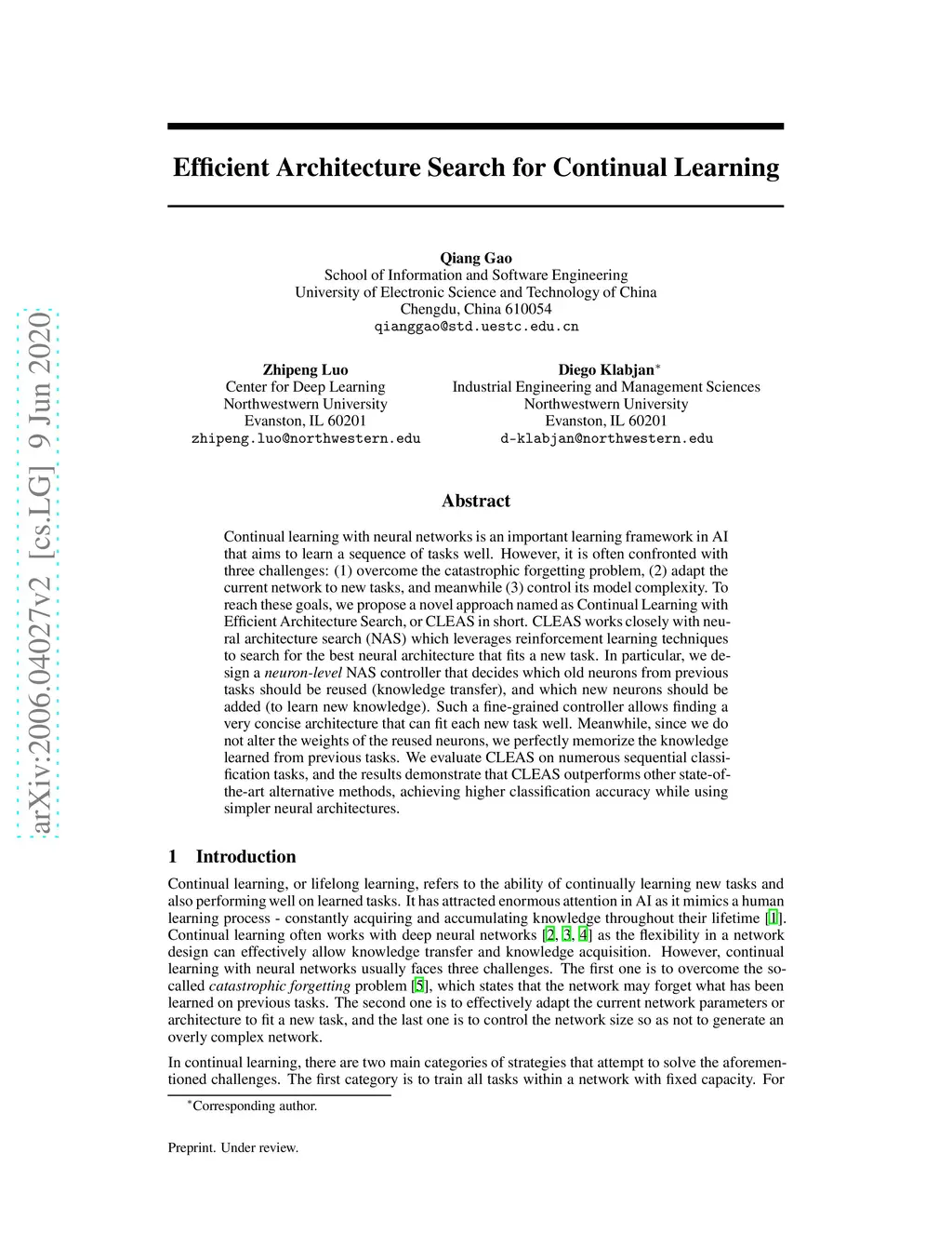 Continual learning with neural networks is an important learning framework in AI that aims to learn a sequence of tasks well. However, it is often confronted with three challenges: (1) overcome the catastrophic forgetting problem, (2) adapt the current network to new tasks, and meanwhile (3) control its model complexity. To reach these goals, we propose a novel approach named as Continual Learning with Efficient Architecture Search, or CLEAS in short. CLEAS works closely with neural architecture search (NAS) which leverages reinforcement learning techniques to search for the best neural architecture that fits a new task. In particular, we design a neuron-level NAS controller that decides which old neurons from previous tasks should be reused (knowledge transfer), and which new neurons should be added (to learn new knowledge). Such a fine-grained controller allows one to find a very concise architecture that can fit each new task well. Meanwhile, since we do not alter the weights of the reused neurons, we perfectly memorize the knowledge learned from previous tasks. We evaluate CLEAS on numerous sequential classification tasks, and the results demonstrate that CLEAS outperforms other state-of-the-art alternative methods, achieving higher classification accuracy while using simpler neural architectures.