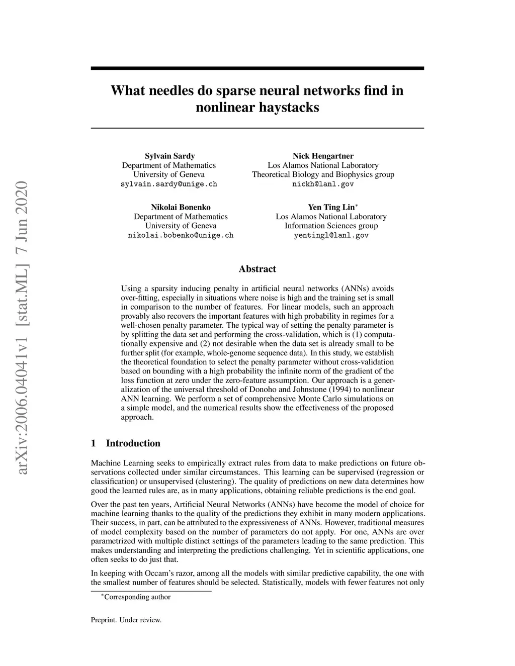 Using a sparsity inducing penalty in artificial neural networks (ANNs) avoids over-fitting, especially in situations where noise is high and the training set is small in comparison to the number of features. For linear models, such an approach provably also recovers the important features with high probability in regimes for a well-chosen penalty parameter. The typical way of setting the penalty parameter is by splitting the data set and performing the cross-validation, which is (1) computationally expensive and (2) not desirable when the data set is already small to be further split (for example, whole-genome sequence data). In this study, we establish the theoretical foundation to select the penalty parameter without cross-validation based on bounding with a high probability the infinite norm of the gradient of the loss function at zero under the zero-feature assumption. Our approach is a generalization of the universal threshold of Donoho and Johnstone (1994) to nonlinear ANN learning. We perform a set of comprehensive Monte Carlo simulations on a simple model, and the numerical results show the effectiveness of the proposed approach.