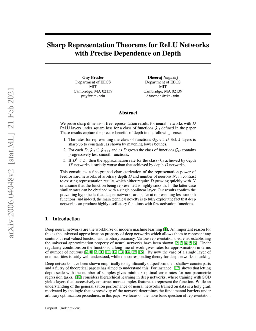 We prove sharp dimension-free representation results for neural networks with ReLU layers under square loss for a class of functions defined in the paper. These results capture the precise benefits of depth in the following sense: 1. The rates for representing the class of functions via ReLU layers is sharp up to constants, as shown by matching lower bounds. 2. For each , and as grows the class of functions contains progressively less smooth functions. 3. If , then the approximation rate for the class achieved by depth networks is strictly worse than that achieved by depth networks. This constitutes a fine-grained characterization of the representation power of feedforward networks of arbitrary depth and number of neurons , in contrast to existing representation results which either require growing quickly with or assume that the function being represented is highly smooth. In the latter case similar rates can be obtained with a single nonlinear layer. Our results confirm the prevailing hypothesis that deeper networks are better at representing less smooth functions, and indeed, the main technical novelty is to fully exploit the fact that deep networks can produce highly oscillatory functions with few activation functions.