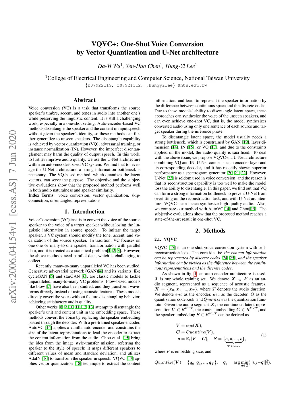 VQVC+: One-Shot Voice Conversion by Vector Quantization and U-Net