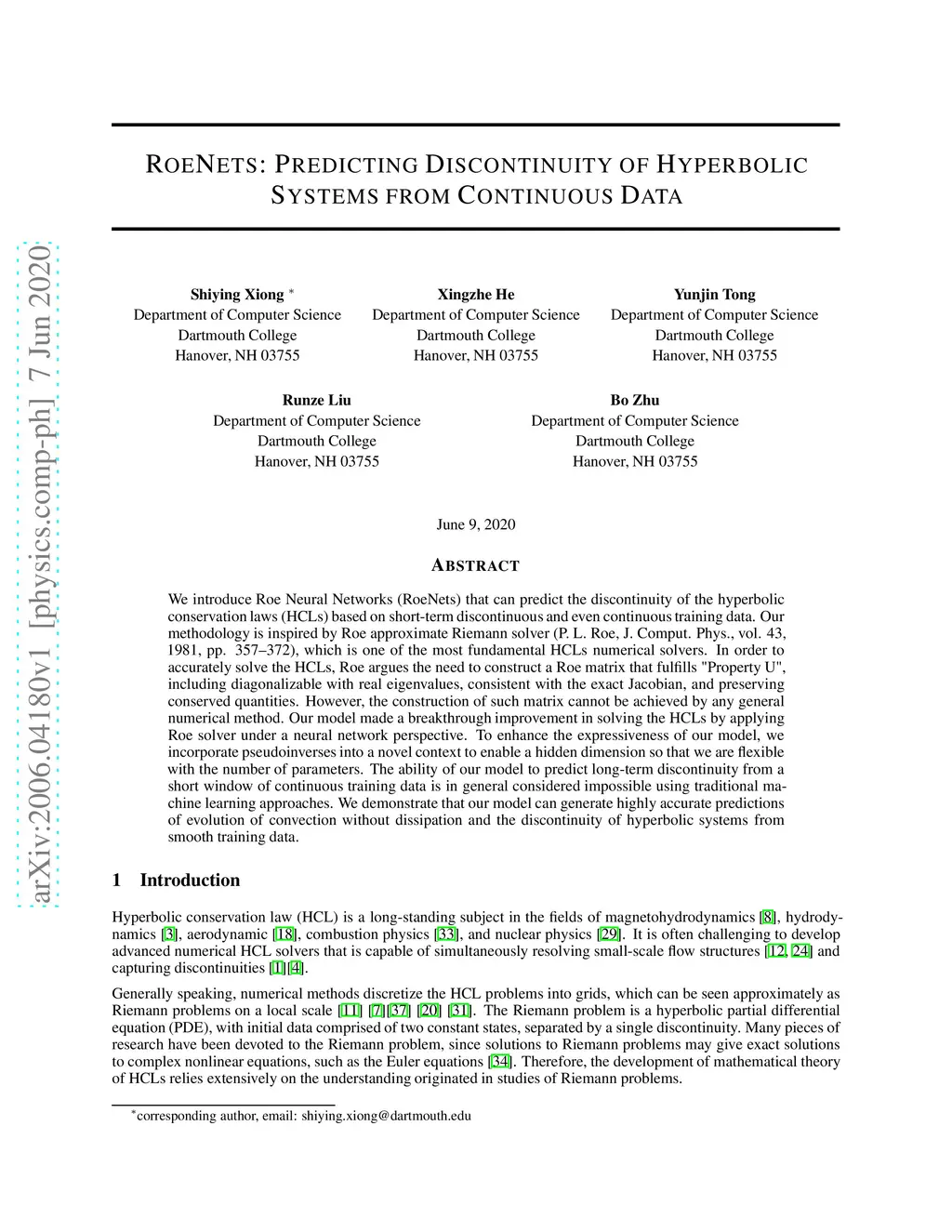 RoeNets: Predicting Discontinuity of Hyperbolic Systems from Continuous