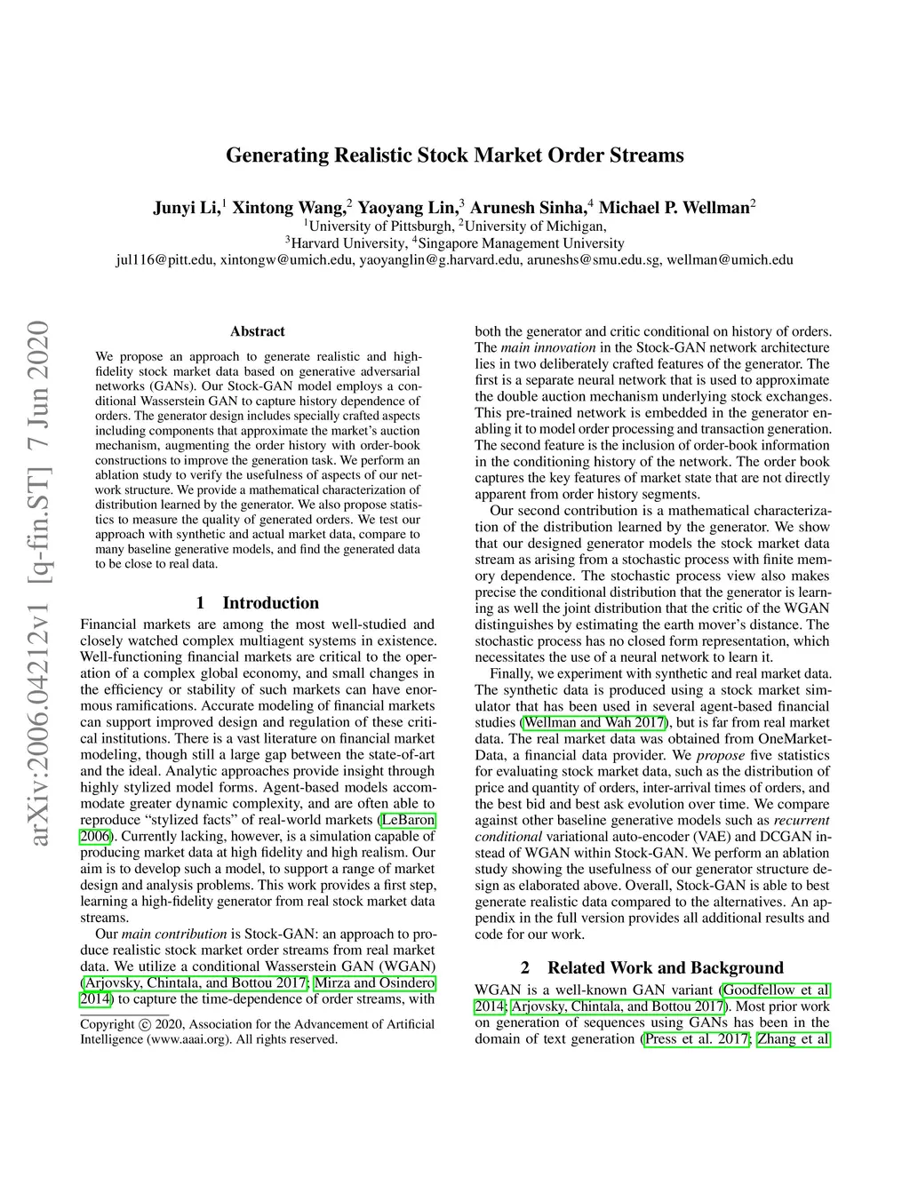 We propose an approach to generate realistic and high-fidelity stock market data based on generative adversarial networks (GANs). Our Stock-GAN model employs a conditional Wasserstein GAN to capture history dependence of orders. The generator design includes specially crafted aspects including components that approximate the market's auction mechanism, augmenting the order history with order-book constructions to improve the generation task. We perform an ablation study to verify the usefulness of aspects of our network structure. We provide a mathematical characterization of distribution learned by the generator. We also propose statistics to measure the quality of generated orders. We test our approach with synthetic and actual market data, compare to many baseline generative models, and find the generated data to be close to real data.