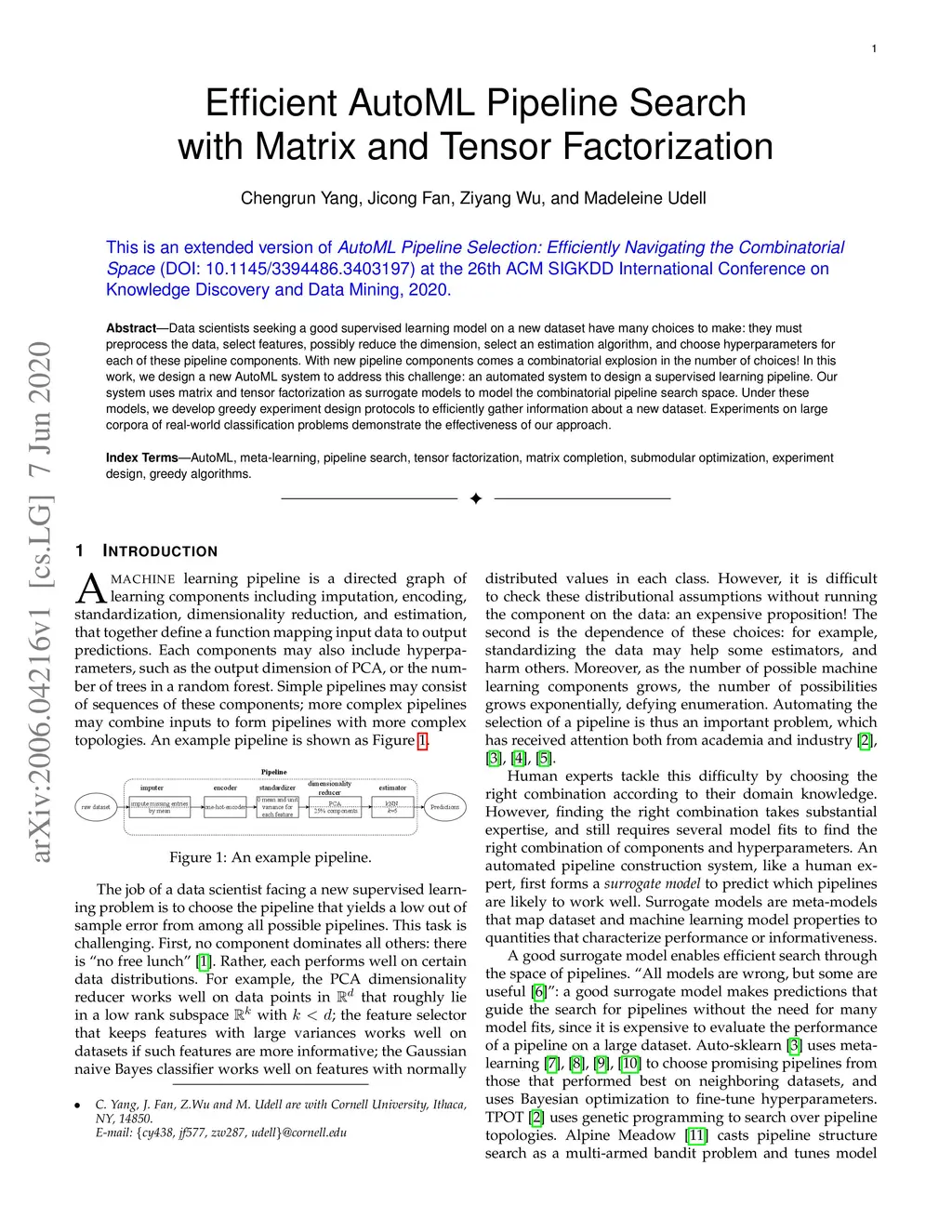 Data scientists seeking a good supervised learning model on a new dataset have many choices to make: they must preprocess the data, select features, possibly reduce the dimension, select an estimation algorithm, and choose hyperparameters for each of these pipeline components. With new pipeline components comes a combinatorial explosion in the number of choices! In this work, we design a new AutoML system to address this challenge: an automated system to design a supervised learning pipeline. Our system uses matrix and tensor factorization as surrogate models to model the combinatorial pipeline search space. Under these models, we develop greedy experiment design protocols to efficiently gather information about a new dataset. Experiments on large corpora of real-world classification problems demonstrate the effectiveness of our approach.