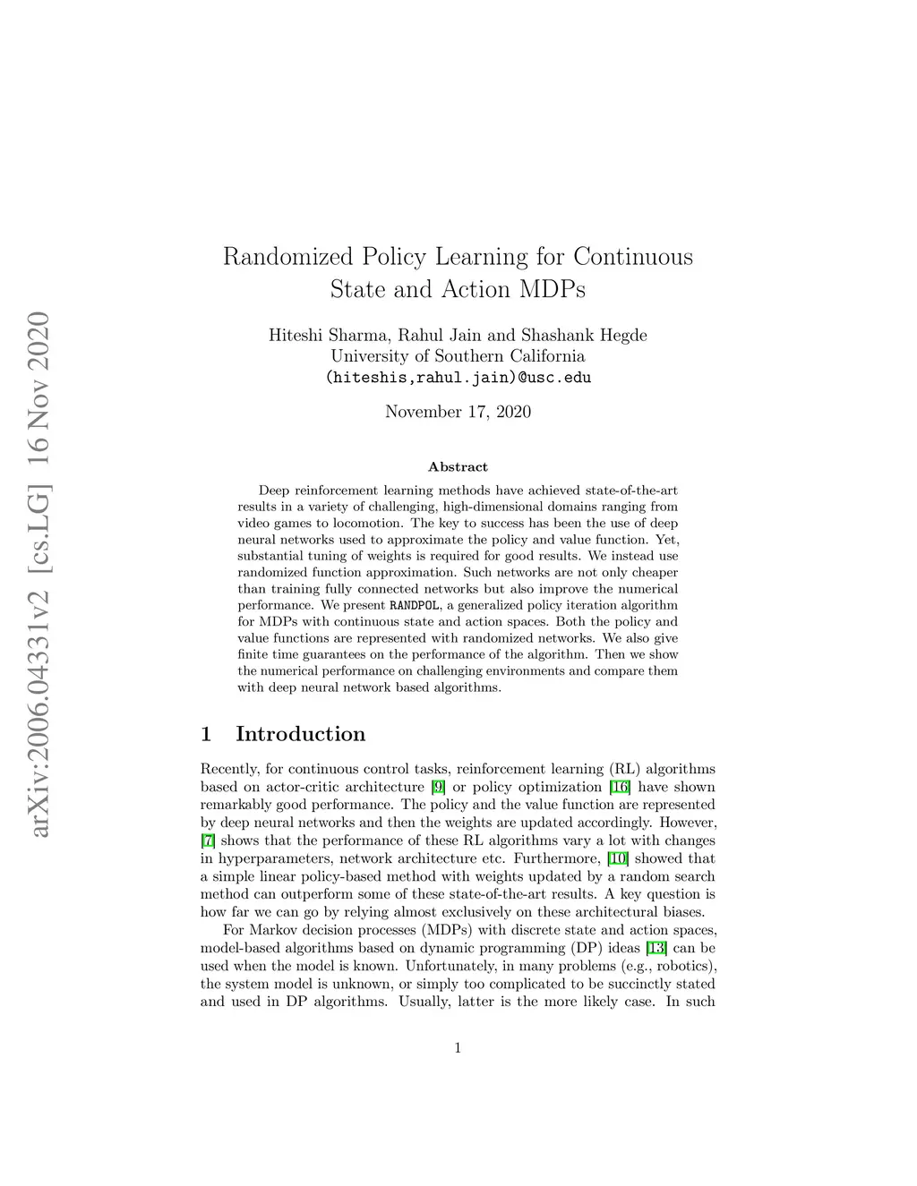 Randomized Policy Learning for Continuous State and Action MDPs