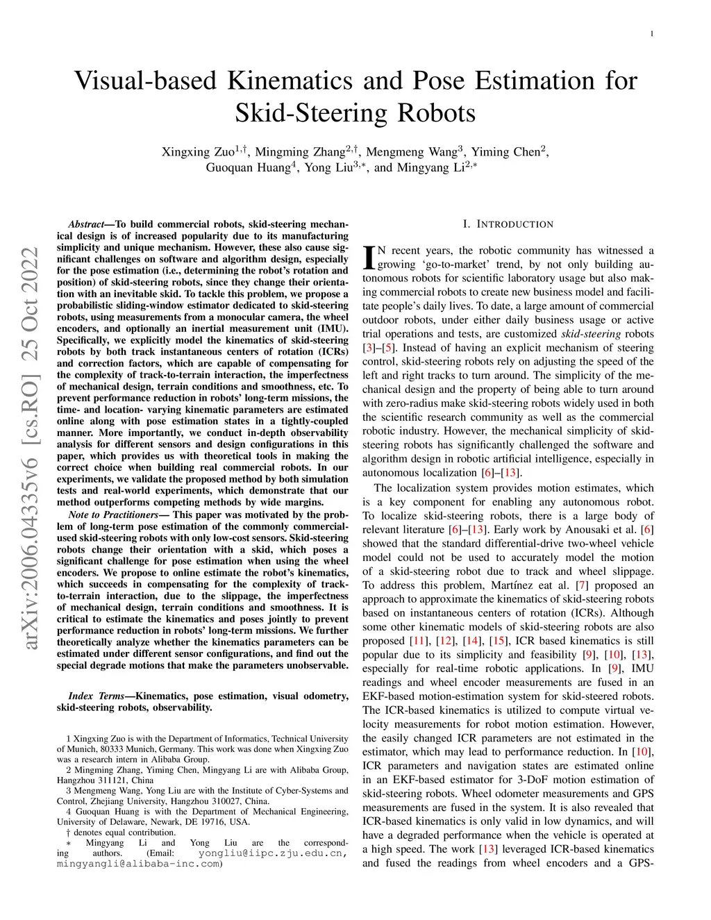 In recent years, the volume of the commercial mobile robot market has been continuously growing due to the maturity of both hardware and software technology. To build commercial robots, skid-steering mechanical design is of increased popularity due to its manufacturing simplicity and unique hardware properties. However, this causes challenges on software and algorithm design, especially for localization (i.e., determining the robot's rotation and position). While the general localization algorithms have been extensively studied in research communities, there are still fundamental problems that need to be resolved for localizing skid-steering robots. To tackle this problem, we propose a probabilistic sliding-window estimator dedicated to skid-steering robots, using measurements from a monocular camera, the wheel encoders, and optionally an inertial measurement unit (IMU). Specifically, we explicitly model the kinematics of skid-steering robots by both track instantaneous centers of rotation (ICRs) and correction factors, which are capable of compensating for the complexity of track-to-terrain interaction, the imperfectness of mechanical design, terrain conditions and smoothness, and so on. These time and location varying kinematic parameters are estimated online along with other localization states in a tightly-coupled manner. More importantly, we conduct in-depth observability analysis for different sensors and design configurations in this paper, which provides us with theoretical tools in making the correct choice when building real commercial robots. In our experiments, we validate the proposed method by both simulation tests and real-world experiments, which demonstrate that our method outperforms competing methods by wide margins.