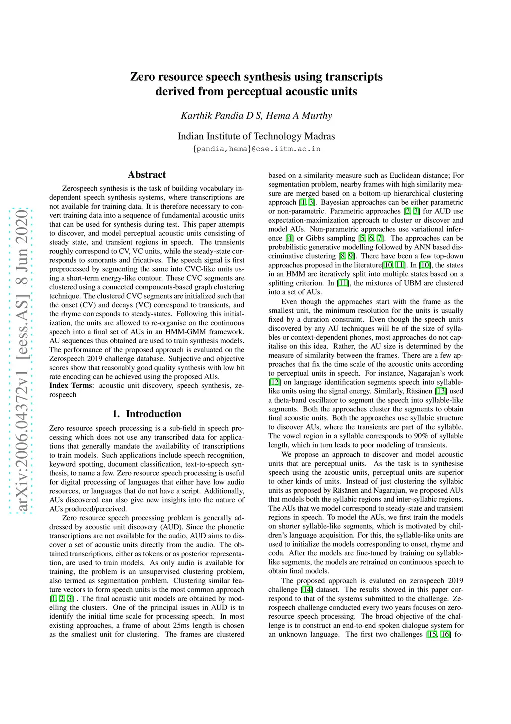 Zerospeech synthesis is the task of building vocabulary independent speech synthesis systems, where transcriptions are not available for training data. It is, therefore, necessary to convert training data into a sequence of fundamental acoustic units that can be used for synthesis during the test. This paper attempts to discover, and model perceptual acoustic units consisting of steady-state, and transient regions in speech. The transients roughly correspond to CV, VC units, while the steady-state corresponds to sonorants and fricatives. The speech signal is first preprocessed by segmenting the same into CVC-like units using a short-term energy-like contour. These CVC segments are clustered using a connected components-based graph clustering technique. The clustered CVC segments are initialized such that the onset (CV) and decays (VC) correspond to transients, and the rhyme corresponds to steady-states. Following this initialization, the units are allowed to re-organise on the continuous speech into a final set of AUs in an HMM-GMM framework. AU sequences thus obtained are used to train synthesis models. The performance of the proposed approach is evaluated on the Zerospeech 2019 challenge database. Subjective and objective scores show that reasonably good quality synthesis with low bit rate encoding can be achieved using the proposed AUs.