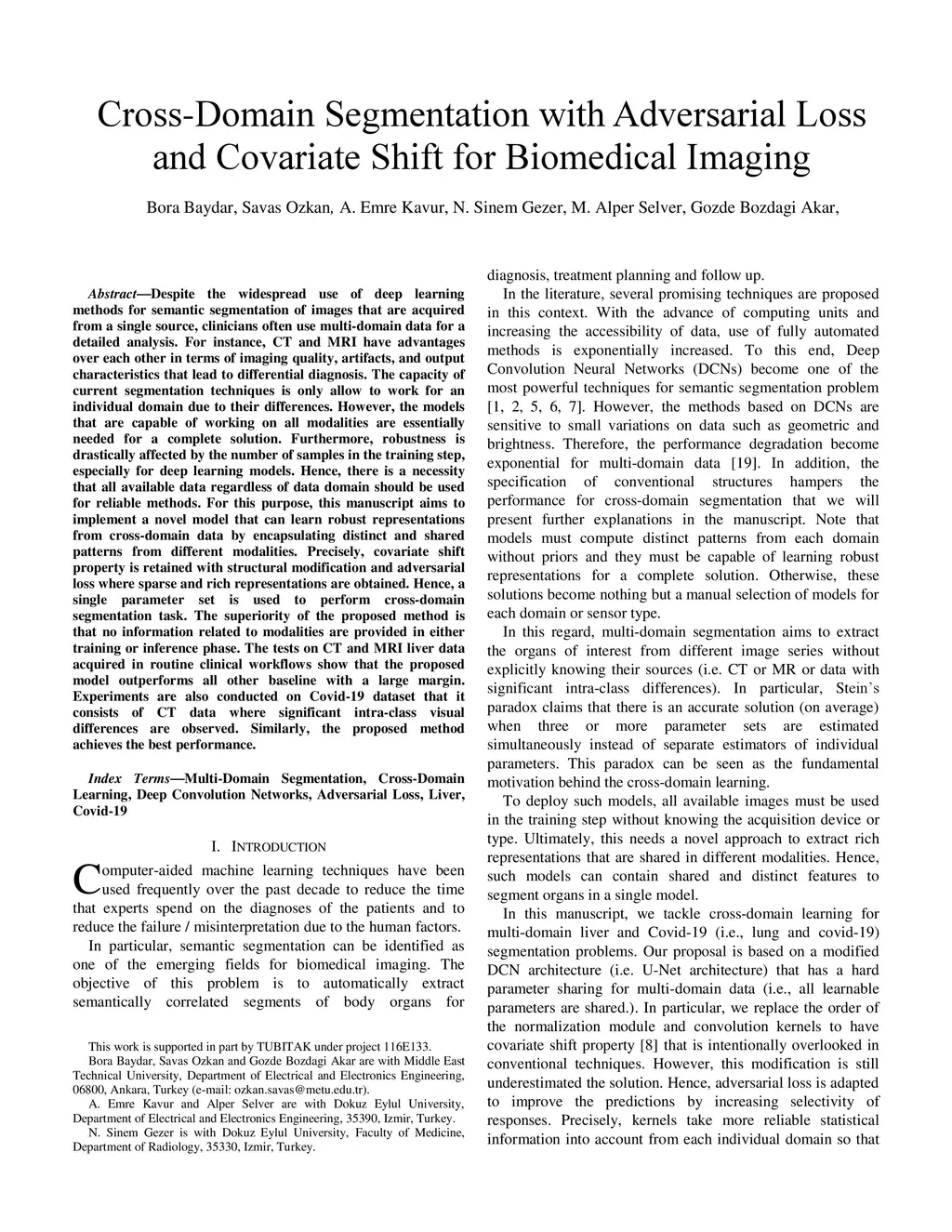 Despite the widespread use of deep learning methods for semantic segmentation of images that are acquired from a single source, clinicians often use multi-domain data for a detailed analysis. For instance, CT and MRI have advantages over each other in terms of imaging quality, artifacts, and output characteristics that lead to differential diagnosis. The capacity of current segmentation techniques is only allow to work for an individual domain due to their differences. However, the models that are capable of working on all modalities are essentially needed for a complete solution. Furthermore, robustness is drastically affected by the number of samples in the training step, especially for deep learning models. Hence, there is a necessity that all available data regardless of data domain should be used for reliable methods. For this purpose, this manuscript aims to implement a novel model that can learn robust representations from cross-domain data by encapsulating distinct and shared patterns from different modalities. Precisely, covariate shift property is retained with structural modification and adversarial loss where sparse and rich representations are obtained. Hence, a single parameter set is used to perform cross-domain segmentation task. The superiority of the proposed method is that no information related to modalities are provided in either training or inference phase. The tests on CT and MRI liver data acquired in routine clinical workflows show that the proposed model outperforms all other baseline with a large margin. Experiments are also conducted on Covid-19 dataset that it consists of CT data where significant intra-class visual differences are observed. Similarly, the proposed method achieves the best performance.