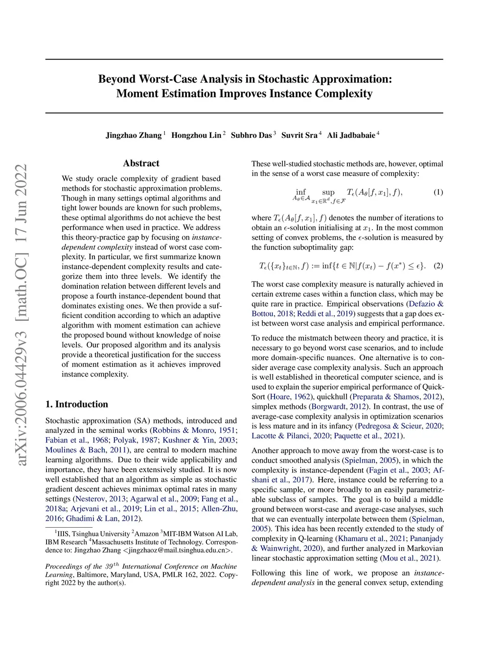 We study oracle complexity of gradient based methods for stochastic approximation problems. Though in many settings optimal algorithms and tight lower bounds are known for such problems, these optimal algorithms do not achieve the best performance when used in practice. We address this theory-practice gap by focusing on instance-dependent complexity instead of worst case complexity. In particular, we first summarize known instance-dependent complexity results and categorize them into three levels. We identify the domination relation between different levels and propose a fourth instance-dependent bound that dominates existing ones. We then provide a sufficient condition according to which an adaptive algorithm with moment estimation can achieve the proposed bound without knowledge of noise levels. Our proposed algorithm and its analysis provide a theoretical justification for the success of moment estimation as it achieves improved instance complexity.
