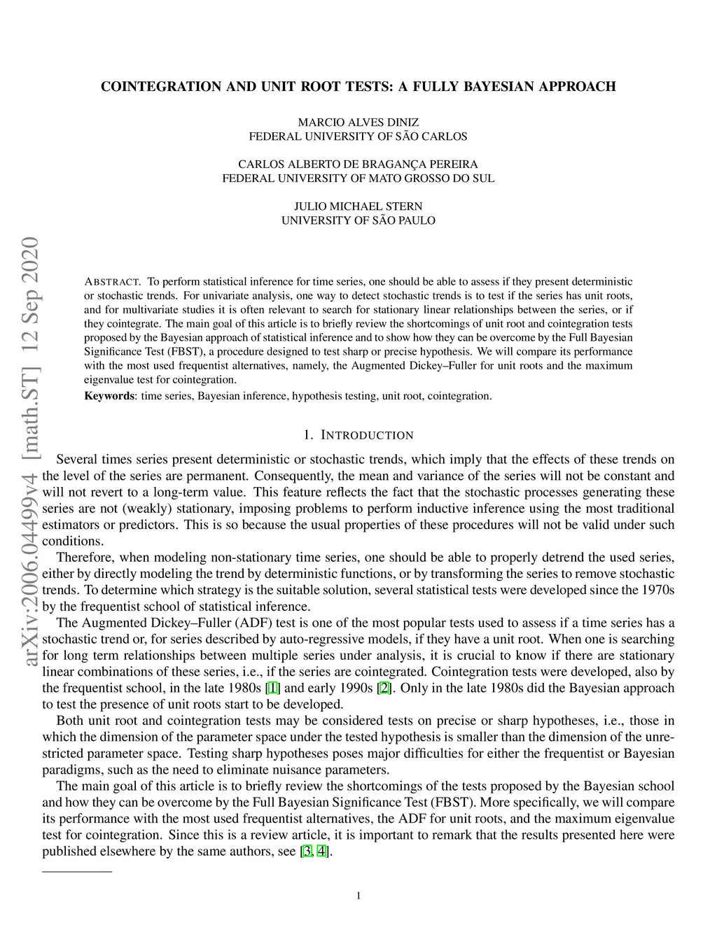 To perform statistical inference for time series, one should be able to assess if they present deterministic or stochastic trends. For univariate analysis one way to detect stochastic trends is to test if the series has unit roots, and for multivariate studies it is often relevant to search for stationary linear relationships between the series, or if they cointegrate. The main goal of this article is to briefly review the shortcomings of unit root and cointegration tests proposed by the Bayesian approach of statistical inference and to show how they can be overcome by the fully Bayesian significance test (FBST), a procedure designed to test sharp or precise hypothesis. We will compare its performance with the most used frequentist alternatives, namely, the Augmented Dickey-Fuller for unit roots and the maximum eigenvalue test for cointegration. Keywords: Time series; Bayesian inference; Hypothesis testing; Unit root; Cointegration.