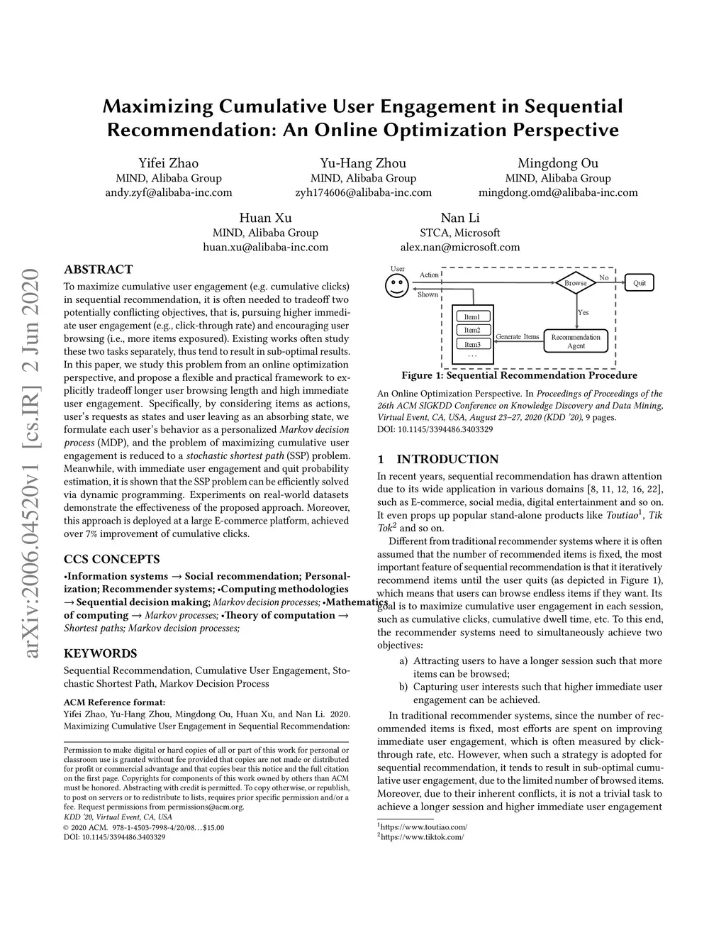 To maximize cumulative user engagement (e.g. cumulative clicks) in sequential recommendation, it is often needed to tradeoff two potentially conflicting objectives, that is, pursuing higher immediate user engagement (e.g., click-through rate) and encouraging user browsing (i.e., more items exposured). Existing works often study these two tasks separately, thus tend to result in sub-optimal results. In this paper, we study this problem from an online optimization perspective, and propose a flexible and practical framework to explicitly tradeoff longer user browsing length and high immediate user engagement. Specifically, by considering items as actions, user's requests as states and user leaving as an absorbing state, we formulate each user's behavior as a personalized Markov decision process (MDP), and the problem of maximizing cumulative user engagement is reduced to a stochastic shortest path (SSP) problem. Meanwhile, with immediate user engagement and quit probability estimation, it is shown that the SSP problem can be efficiently solved via dynamic programming. Experiments on real-world datasets demonstrate the effectiveness of the proposed approach. Moreover, this approach is deployed at a large E-commerce platform, achieved over 7% improvement of cumulative clicks.