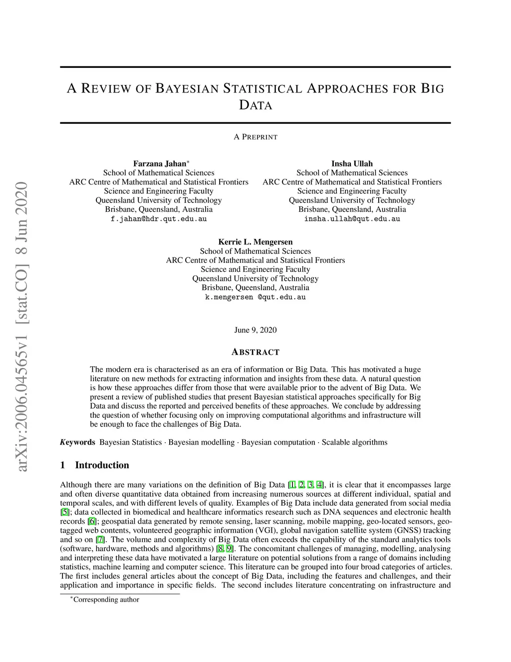 The modern era is characterised as an era of information or Big Data. This has motivated a huge literature on new methods for extracting information and insights from these data. A natural question is how these approaches differ from those that were available prior to the advent of Big Data. We present a review of published studies that present Bayesian statistical approaches specifically for Big Data and discuss the reported and perceived benefits of these approaches. We conclude by addressing the question of whether focusing only on improving computational algorithms and infrastructure will be enough to face the challenges of Big Data.