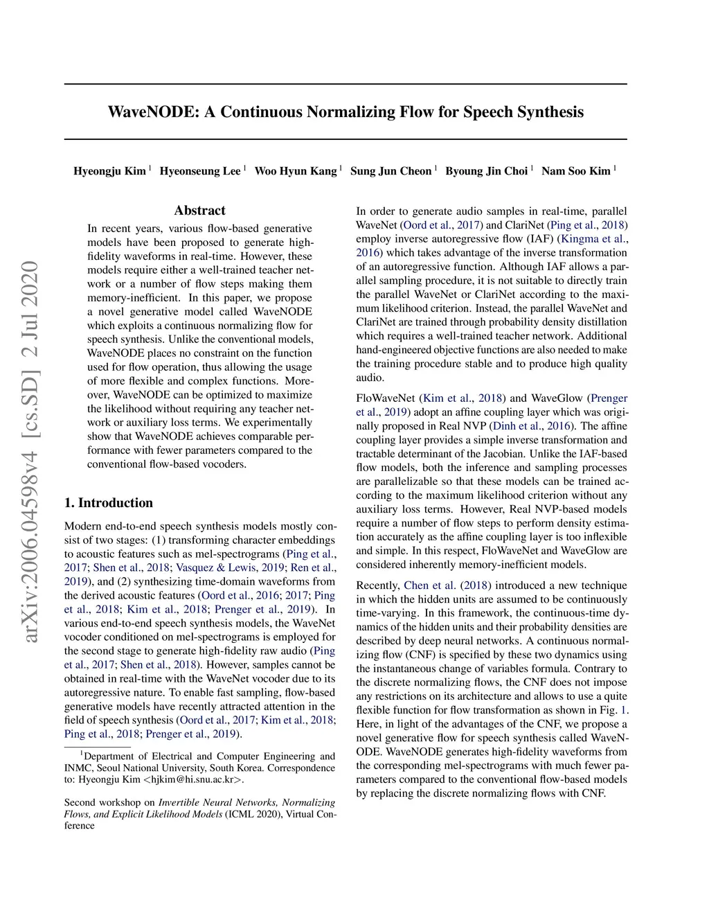In recent years, various flow-based generative models have been proposed to generate high-fidelity waveforms in real-time. However, these models require either a well-trained teacher network or a number of flow steps making them memory-inefficient. In this paper, we propose a novel generative model called WaveNODE which exploits a continuous normalizing flow for speech synthesis. Unlike the conventional models, WaveNODE places no constraint on the function used for flow operation, thus allowing the usage of more flexible and complex functions. Moreover, WaveNODE can be optimized to maximize the likelihood without requiring any teacher network or auxiliary loss terms. We experimentally show that WaveNODE achieves comparable performance with fewer parameters compared to the conventional flow-based vocoders.