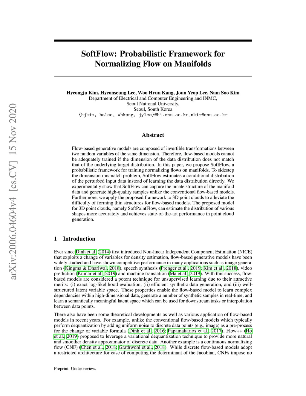 Flow-based generative models are composed of invertible transformations between two random variables of the same dimension. Therefore, flow-based models cannot be adequately trained if the dimension of the data distribution does not match that of the underlying target distribution. In this paper, we propose SoftFlow, a probabilistic framework for training normalizing flows on manifolds. To sidestep the dimension mismatch problem, SoftFlow estimates a conditional distribution of the perturbed input data instead of learning the data distribution directly. We experimentally show that SoftFlow can capture the innate structure of the manifold data and generate high-quality samples unlike the conventional flow-based models. Furthermore, we apply the proposed framework to 3D point clouds to alleviate the difficulty of forming thin structures for flow-based models. The proposed model for 3D point clouds, namely SoftPointFlow, can estimate the distribution of various shapes more accurately and achieves state-of-the-art performance in point cloud generation.