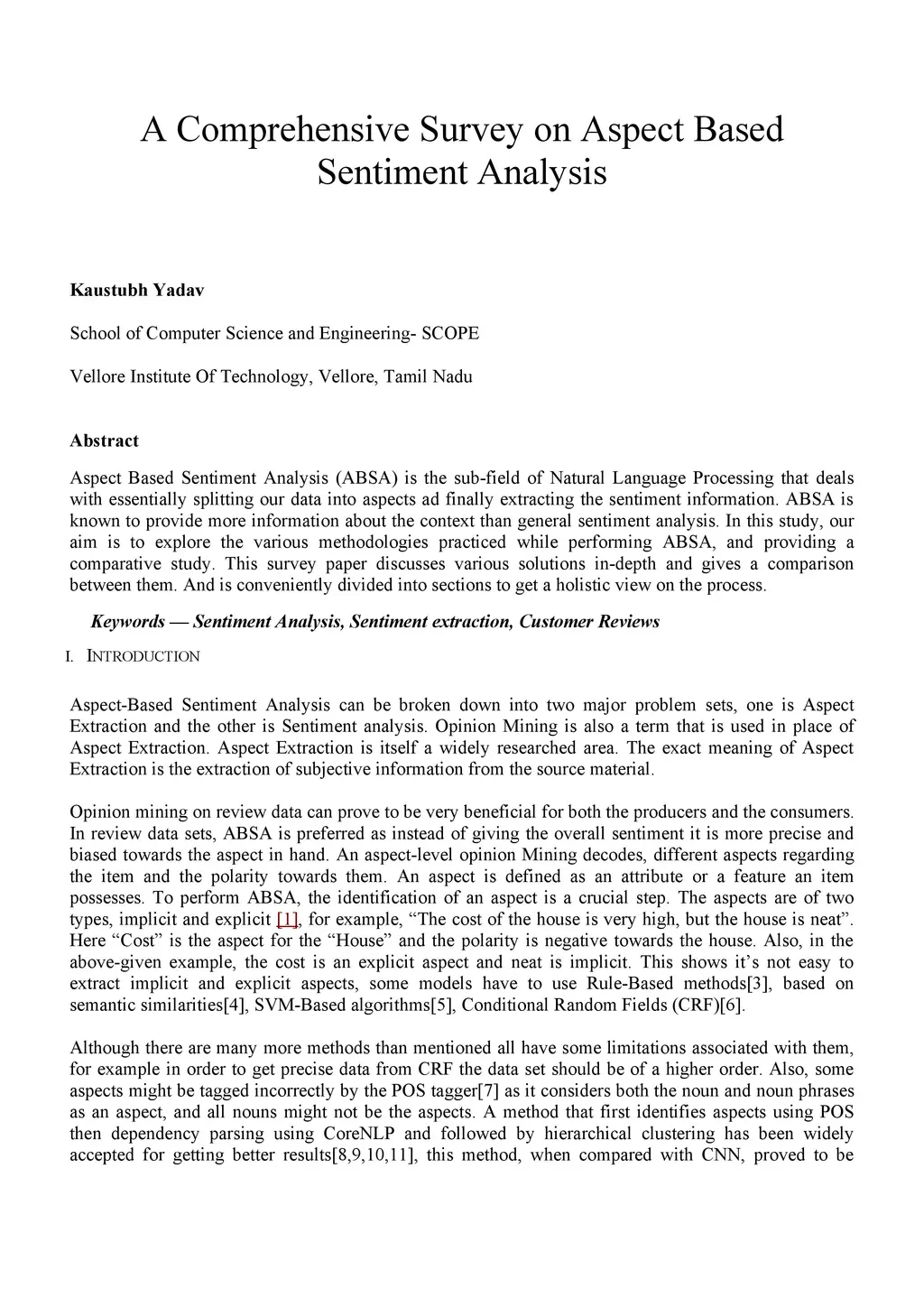 Aspect Based Sentiment Analysis (ABSA) is the sub-field of Natural Language Processing that deals with essentially splitting our data into aspects ad finally extracting the sentiment information. ABSA is known to provide more information about the context than general sentiment analysis. In this study, our aim is to explore the various methodologies practiced while performing ABSA, and providing a comparative study. This survey paper discusses various solutions in-depth and gives a comparison between them. And is conveniently divided into sections to get a holistic view on the process.
