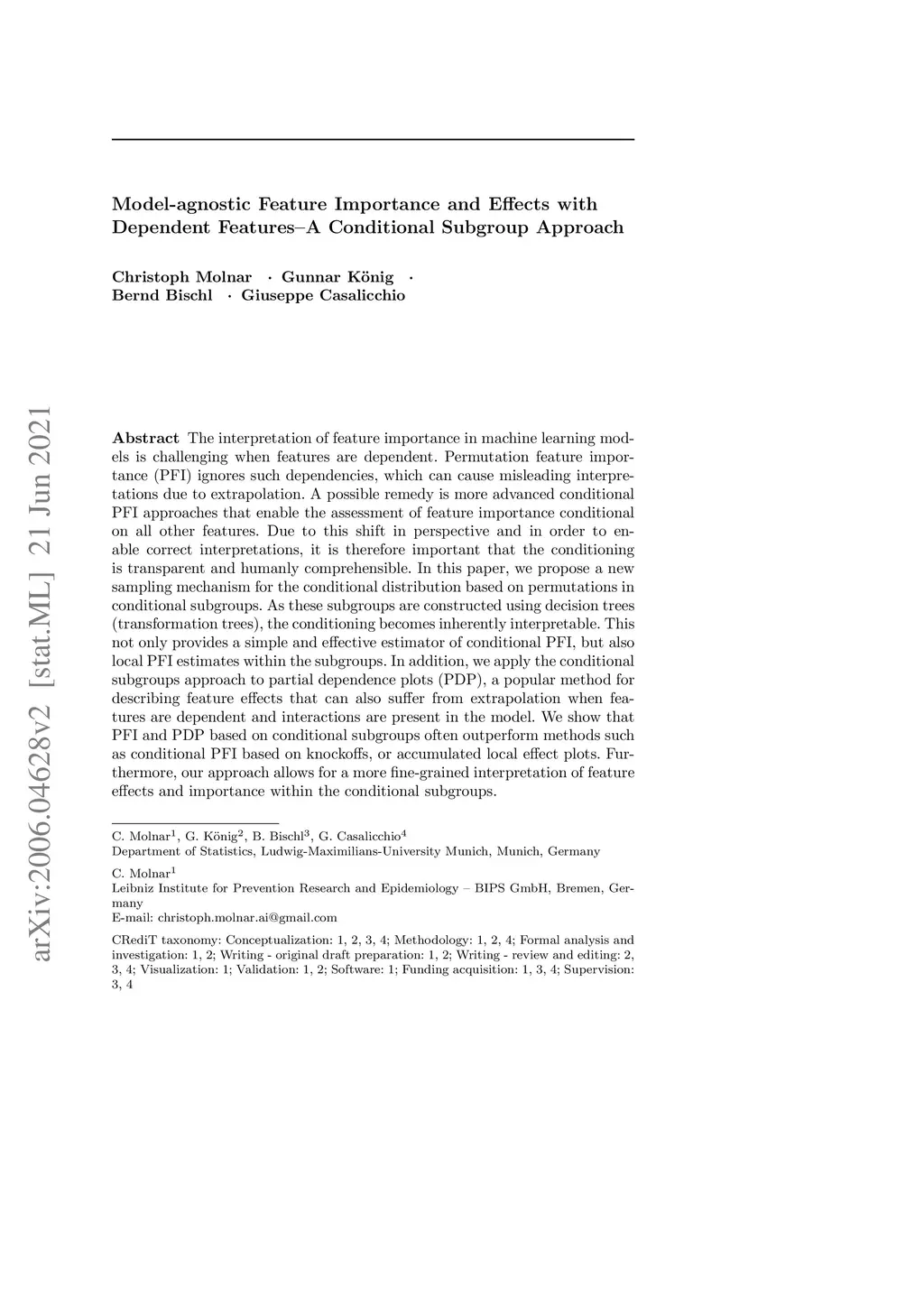 The interpretation of feature importance in machine learning models is challenging when features are dependent. Permutation feature importance (PFI) ignores such dependencies, which can cause misleading interpretations due to extrapolation. A possible remedy is more advanced conditional PFI approaches that enable the assessment of feature importance conditional on all other features. Due to this shift in perspective and in order to enable correct interpretations, it is therefore important that the conditioning is transparent and humanly comprehensible. In this paper, we propose a new sampling mechanism for the conditional distribution based on permutations in conditional subgroups. As these subgroups are constructed using decision trees (transformation trees), the conditioning becomes inherently interpretable. This not only provides a simple and effective estimator of conditional PFI, but also local PFI estimates within the subgroups. In addition, we apply the conditional subgroups approach to partial dependence plots (PDP), a popular method for describing feature effects that can also suffer from extrapolation when features are dependent and interactions are present in the model. We show that PFI and PDP based on conditional subgroups often outperform methods such as conditional PFI based on knockoffs, or accumulated local effect plots. Furthermore, our approach allows for a more fine-grained interpretation of feature effects and importance within the conditional subgroups.