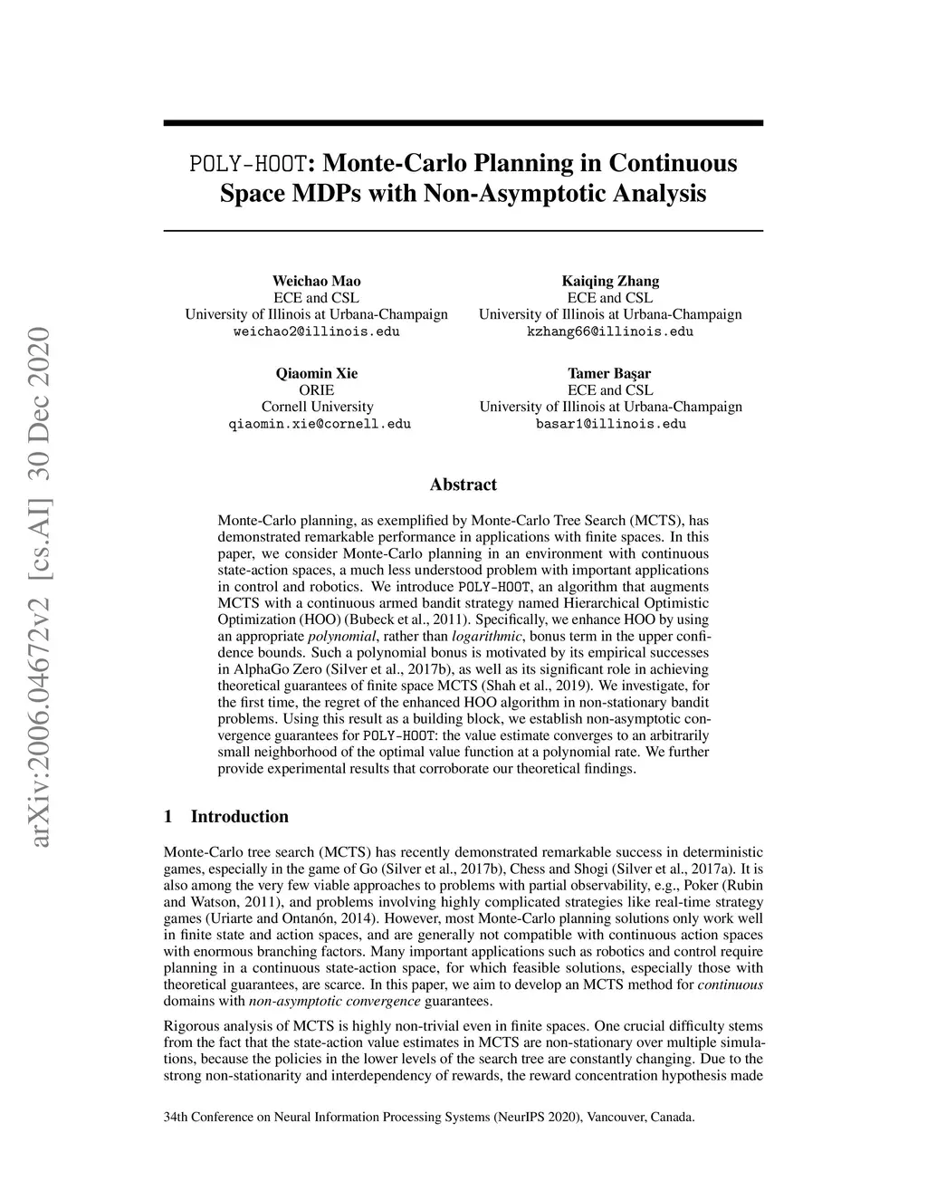Monte-Carlo planning, as exemplified by Monte-Carlo Tree Search (MCTS), has demonstrated remarkable performance in applications with finite spaces. In this paper, we consider Monte-Carlo planning in an environment with continuous state-action spaces, a much less understood problem with important applications in control and robotics. We introduce POLY-HOOT, an algorithm that augments MCTS with a continuous armed bandit strategy named Hierarchical Optimistic Optimization (HOO) (Bubeck et al., 2011). Specifically, we enhance HOO by using an appropriate polynomial, rather than logarithmic, bonus term in the upper confidence bounds. Such a polynomial bonus is motivated by its empirical successes in AlphaGo Zero (Silver et al., 2017b), as well as its significant role in achieving theoretical guarantees of finite space MCTS (Shah et al., 2019). We investigate, for the first time, the regret of the enhanced HOO algorithm in non-stationary bandit problems. Using this result as a building block, we establish non-asymptotic convergence guarantees for POLY-HOOT: the value estimate converges to an arbitrarily small neighborhood of the optimal value function at a polynomial rate. We further provide experimental results that corroborate our theoretical findings.
