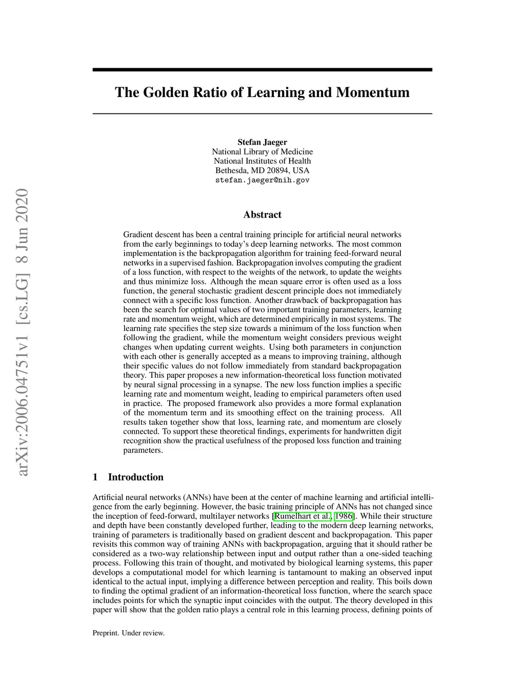 Gradient descent has been a central training principle for artificial neural networks from the early beginnings to today's deep learning networks. The most common implementation is the backpropagation algorithm for training feed-forward neural networks in a supervised fashion. Backpropagation involves computing the gradient of a loss function, with respect to the weights of the network, to update the weights and thus minimize loss. Although the mean square error is often used as a loss function, the general stochastic gradient descent principle does not immediately connect with a specific loss function. Another drawback of backpropagation has been the search for optimal values of two important training parameters, learning rate and momentum weight, which are determined empirically in most systems. The learning rate specifies the step size towards a minimum of the loss function when following the gradient, while the momentum weight considers previous weight changes when updating current weights. Using both parameters in conjunction with each other is generally accepted as a means to improving training, although their specific values do not follow immediately from standard backpropagation theory. This paper proposes a new information-theoretical loss function motivated by neural signal processing in a synapse. The new loss function implies a specific learning rate and momentum weight, leading to empirical parameters often used in practice. The proposed framework also provides a more formal explanation of the momentum term and its smoothing effect on the training process. All results taken together show that loss, learning rate, and momentum are closely connected. To support these theoretical findings, experiments for handwritten digit recognition show the practical usefulness of the proposed loss function and training parameters.