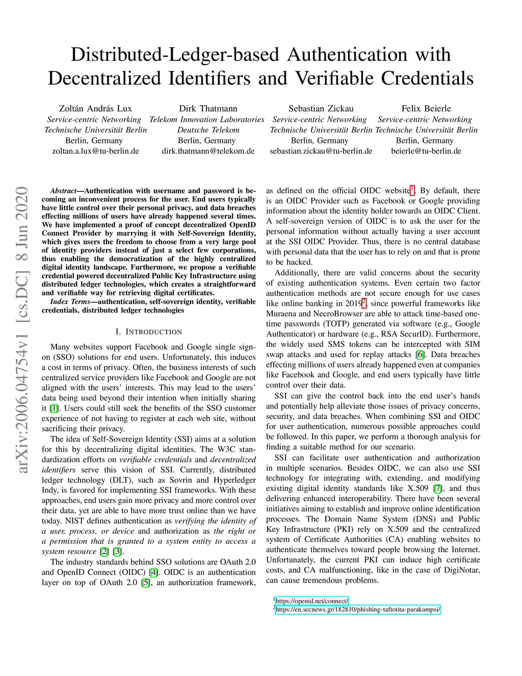 Authentication with username and password is becoming an inconvenient process for the user. End users typically have little control over their personal privacy, and data breaches effecting millions of users have already happened several times. We have implemented a proof of concept decentralized OpenID Connect Provider by marrying it with Self-Sovereign Identity, which gives users the freedom to choose from a very large pool of identity providers instead of just a select few corporations, thus enabling the democratization of the highly centralized digital identity landscape. Furthermore, we propose a verifiable credential powered decentralized Public Key Infrastructure using distributed ledger technologies, which creates a straightforward and verifiable way for retrieving digital certificates.