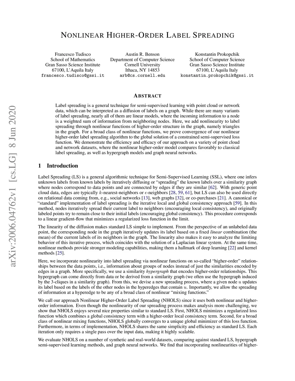 Label spreading is a general technique for semi-supervised learning with point cloud or network data, which can be interpreted as a diffusion of labels on a graph. While there are many variants of label spreading, nearly all of them are linear models, where the incoming information to a node is a weighted sum of information from neighboring nodes. Here, we add nonlinearity to label spreading through nonlinear functions of higher-order structure in the graph, namely triangles in the graph. For a broad class of nonlinear functions, we prove convergence of our nonlinear higher-order label spreading algorithm to the global solution of a constrained semi-supervised loss function. We demonstrate the efficiency and efficacy of our approach on a variety of point cloud and network datasets, where the nonlinear higher-order model compares favorably to classical label spreading, as well as hypergraph models and graph neural networks.