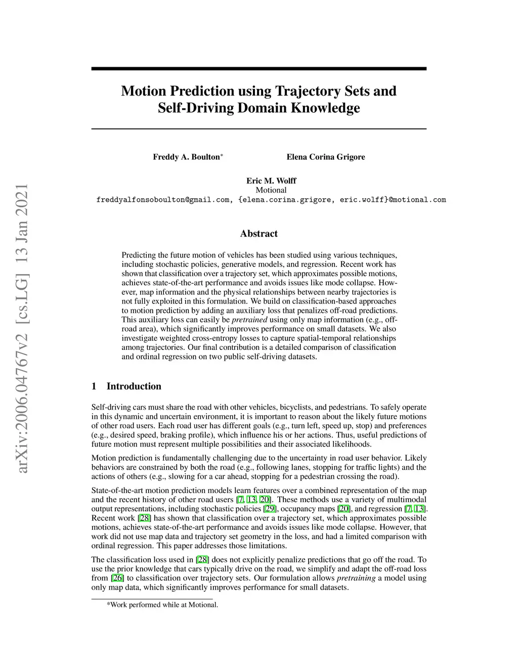 Predicting the future motion of vehicles has been studied using various techniques, including stochastic policies, generative models, and regression. Recent work has shown that classification over a trajectory set, which approximates possible motions, achieves state-of-the-art performance and avoids issues like mode collapse. However, map information and the physical relationships between nearby trajectories is not fully exploited in this formulation. We build on classification-based approaches to motion prediction by adding an auxiliary loss that penalizes off-road predictions. This auxiliary loss can easily be pretrained using only map information (e.g., off-road area), which significantly improves performance on small datasets. We also investigate weighted cross-entropy losses to capture spatial-temporal relationships among trajectories. Our final contribution is a detailed comparison of classification and ordinal regression on two public self-driving datasets.