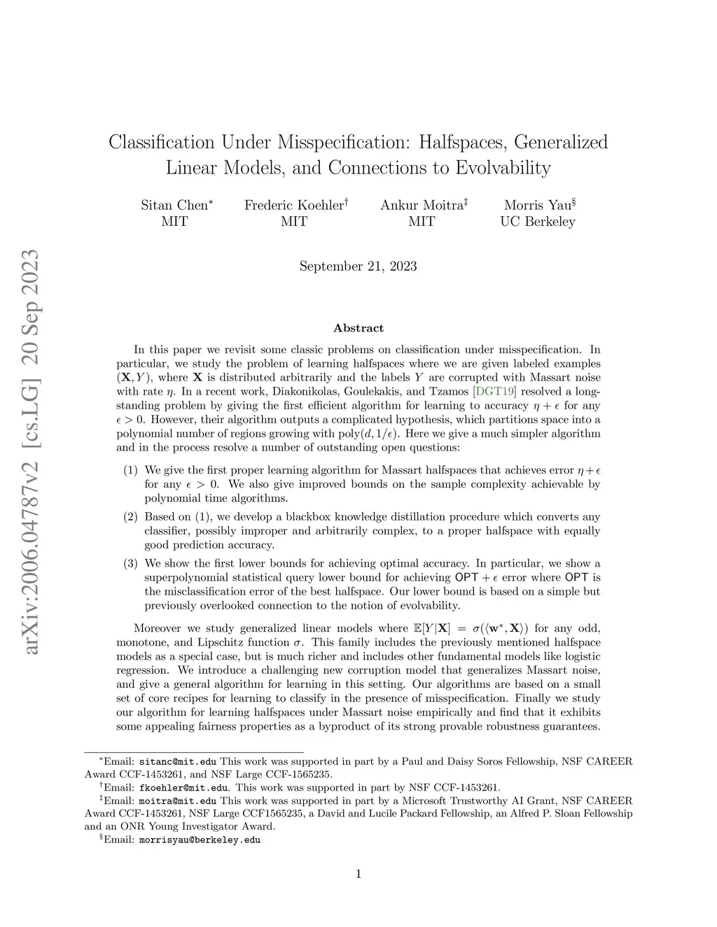 In this paper we revisit some classic problems on classification under misspecification. In particular, we study the problem of learning halfspaces under Massart noise with rate . In a recent work, Diakonikolas, Goulekakis, and Tzamos resolved a long-standing problem by giving the first efficient algorithm for learning to accuracy for any . However, their algorithm outputs a complicated hypothesis, which partitions space into regions. Here we give a much simpler algorithm and in the process resolve a number of outstanding open questions: (1) We give the first proper learner for Massart halfspaces that achieves . We also give improved bounds on the sample complexity achievable by polynomial time algorithms. (2) Based on (1), we develop a blackbox knowledge distillation procedure to convert an arbitrarily complex classifier to an equally good proper classifier. (3) By leveraging a simple but overlooked connection to evolvability, we show any SQ algorithm requires super-polynomially many queries to achieve . Moreover we study generalized linear models where for any odd, monotone, and Lipschitz function . This family includes the previously mentioned halfspace models as a special case, but is much richer and includes other fundamental models like logistic regression. We introduce a challenging new corruption model that generalizes Massart noise, and give a general algorithm for learning in this setting. Our algorithms are based on a small set of core recipes for learning to classify in the presence of misspecification. Finally we study our algorithm for learning halfspaces under Massart noise empirically and find that it exhibits some appealing fairness properties.