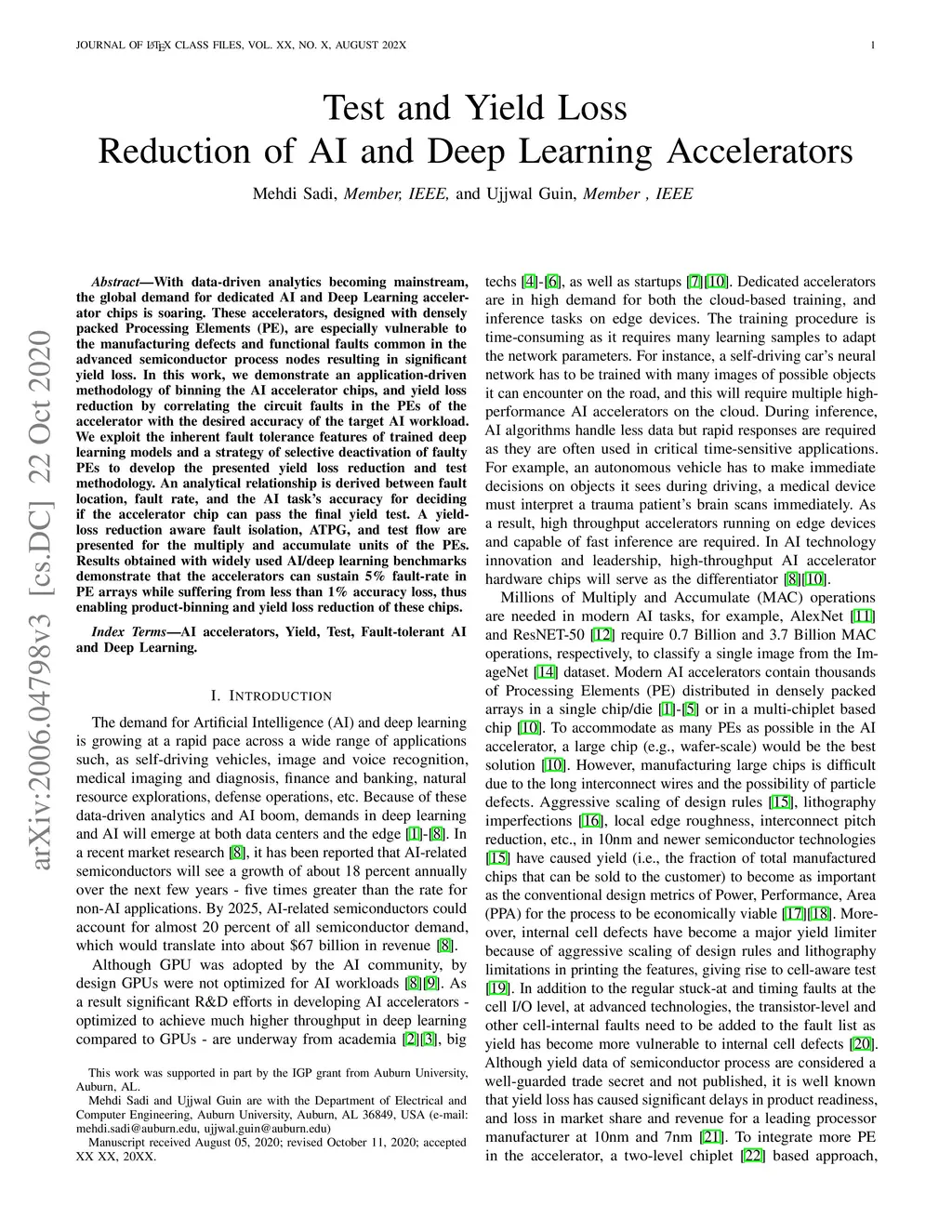Yield Loss Reduction and Test of AI and Deep Learning Accelerators