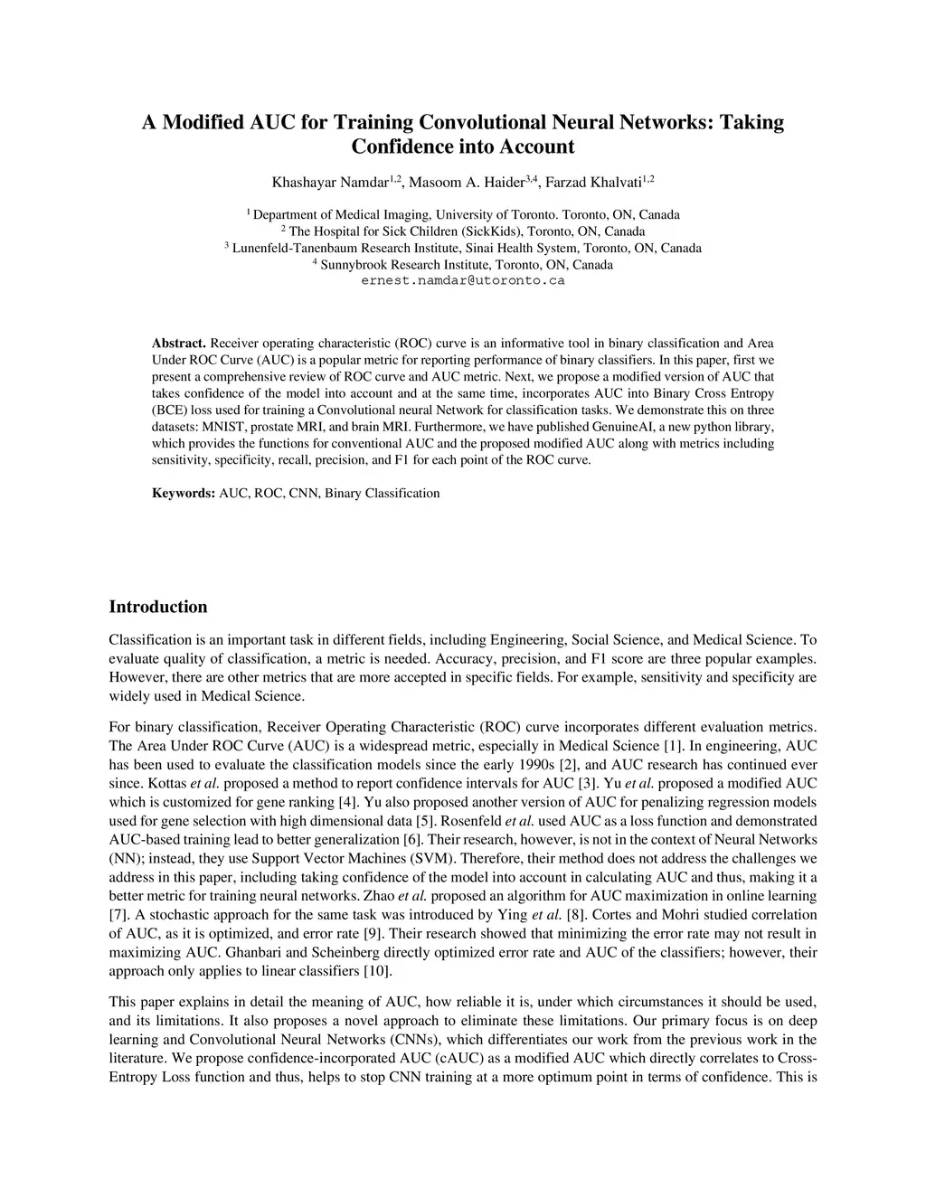 Receiver operating characteristic (ROC) curve is an informative tool in binary classification and Area Under ROC Curve (AUC) is a popular metric for reporting performance of binary classifiers. In this paper, first we present a comprehensive review of ROC curve and AUC metric. Next, we propose a modified version of AUC that takes confidence of the model into account and at the same time, incorporates AUC into Binary Cross Entropy (BCE) loss used for training a Convolutional neural Network for classification tasks. We demonstrate this on three datasets: MNIST, prostate MRI, and brain MRI. Furthermore, we have published GenuineAI, a new python library, which provides the functions for conventional AUC and the proposed modified AUC along with metrics including sensitivity, specificity, recall, precision, and F1 for each point of the ROC curve.