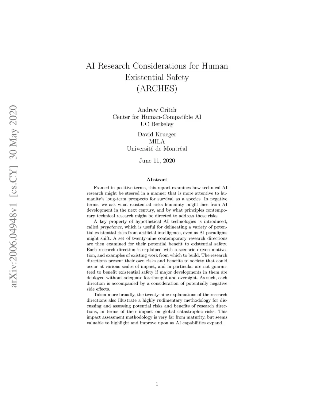 AI Research Considerations for Human Existential Safety (ARCHES)