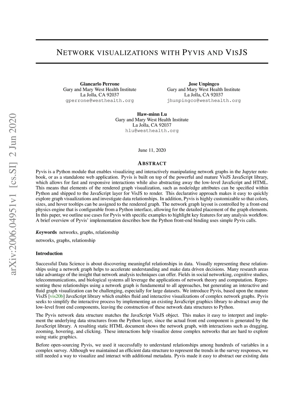 Pyvis is a Python module that enables visualizing and interactively manipulating network graphs in the Jupyter notebook, or as a standalone web application. Pyvis is built on top of the powerful and mature VisJS JavaScript library, which allows for fast and responsive interactions while also abstracting away the low-level JavaScript and HTML. This means that elements of the rendered graph visualization, such as node/edge attributes can be specified within Python and shipped to the JavaScript layer for VisJS to render. This declarative approach makes it easy to quickly explore graph visualizations and investigate data relationships. In addition, Pyvis is highly customizable so that colors, sizes, and hover tooltips can be assigned to the rendered graph. The network graph layout is controlled by a front-end physics engine that is configurable from a Python interface, allowing for the detailed placement of the graph elements. In this paper, we outline use cases for Pyvis with specific examples to highlight key features for any analysis workflow. A brief overview of Pyvis' implementation describes how the Python front-end binding uses simple Pyvis calls.