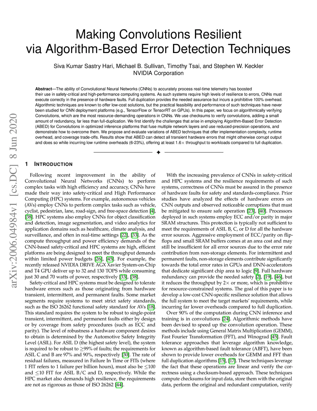 The ability of Convolutional Neural Networks (CNNs) to accurately process real-time telemetry has boosted their use in safety-critical and high-performance computing systems. As such systems require high levels of resilience to errors, CNNs must execute correctly in the presence of hardware faults. Full duplication provides the needed assurance but incurs a prohibitive 100% overhead. Algorithmic techniques are known to offer low-cost solutions, but the practical feasibility and performance of such techniques have never been studied for CNN deployment platforms (e.g., TensorFlow or TensorRT on GPUs). In this paper, we focus on algorithmically verifying Convolutions, which are the most resource-demanding operations in CNNs. We use checksums to verify convolutions, adding a small amount of redundancy, far less than full-duplication. We first identify the challenges that arise in employing Algorithm-Based Error Detection (ABED) for Convolutions in optimized inference platforms that fuse multiple network layers and use reduced-precision operations, and demonstrate how to overcome them. We propose and evaluate variations of ABED techniques that offer implementation complexity, runtime overhead, and coverage trade-offs. Results show that ABED can detect all transient hardware errors that might otherwise corrupt output and does so while incurring low runtime overheads (6-23%), offering at least 1.6X throughput to workloads compared to full duplication.