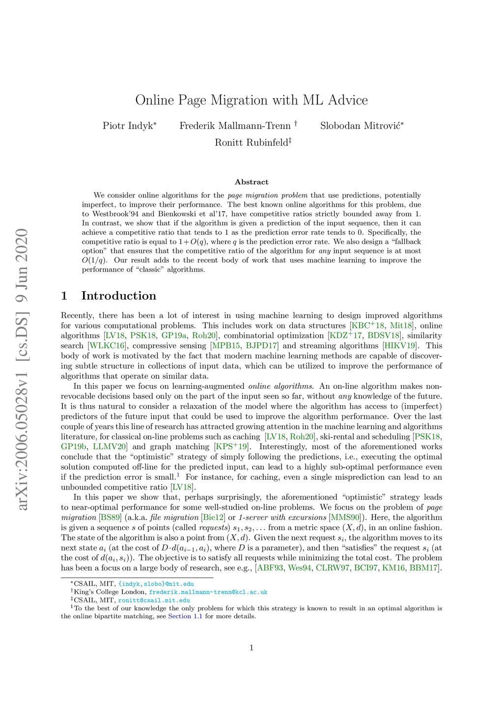 We consider online algorithms for the {\em page migration problem} that use predictions, potentially imperfect, to improve their performance. The best known online algorithms for this problem, due to Westbrook'94 and Bienkowski et al'17, have competitive ratios strictly bounded away from 1. In contrast, we show that if the algorithm is given a prediction of the input sequence, then it can achieve a competitive ratio that tends to as the prediction error rate tends to . Specifically, the competitive ratio is equal to , where is the prediction error rate. We also design a ``fallback option'' that ensures that the competitive ratio of the algorithm for {\em any} input sequence is at most . Our result adds to the recent body of work that uses machine learning to improve the performance of ``classic'' algorithms.