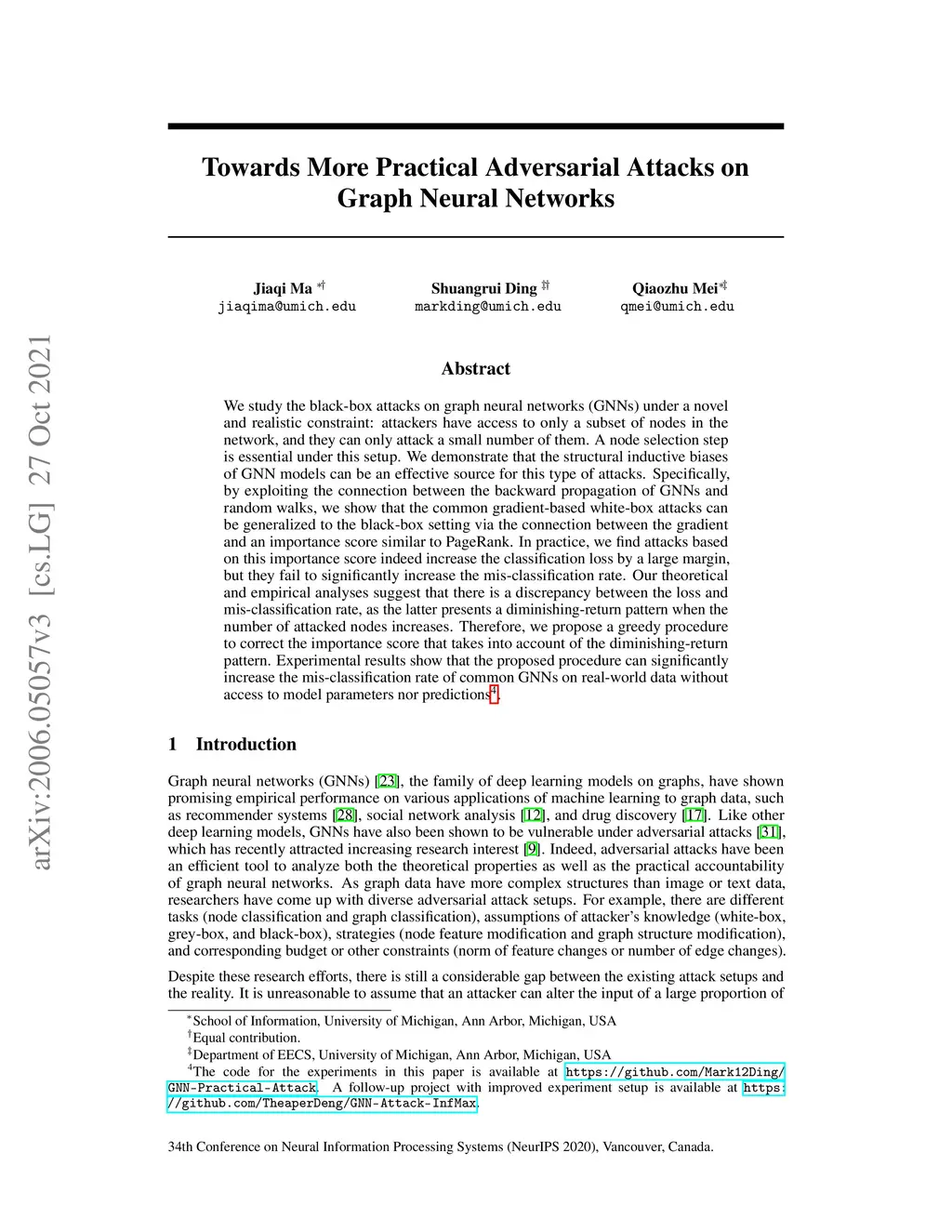 We study the black-box attacks on graph neural networks (GNNs) under a novel and realistic constraint: attackers have access to only a subset of nodes in the network, and they can only attack a small number of them. A node selection step is essential under this setup. We demonstrate that the structural inductive biases of GNN models can be an effective source for this type of attacks. Specifically, by exploiting the connection between the backward propagation of GNNs and random walks, we show that the common gradient-based white-box attacks can be generalized to the black-box setting via the connection between the gradient and an importance score similar to PageRank. In practice, we find attacks based on this importance score indeed increase the classification loss by a large margin, but they fail to significantly increase the mis-classification rate. Our theoretical and empirical analyses suggest that there is a discrepancy between the loss and mis-classification rate, as the latter presents a diminishing-return pattern when the number of attacked nodes increases. Therefore, we propose a greedy procedure to correct the importance score that takes into account of the diminishing-return pattern. Experimental results show that the proposed procedure can significantly increase the mis-classification rate of common GNNs on real-world data without access to model parameters nor predictions.