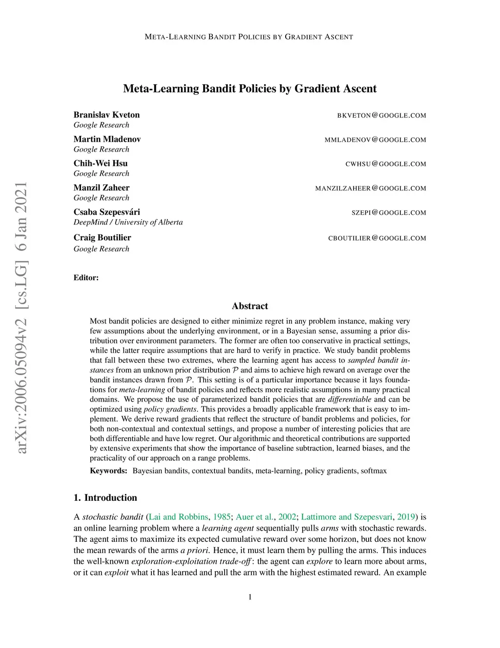 Meta-Learning Bandit Policies by Gradient Ascent
