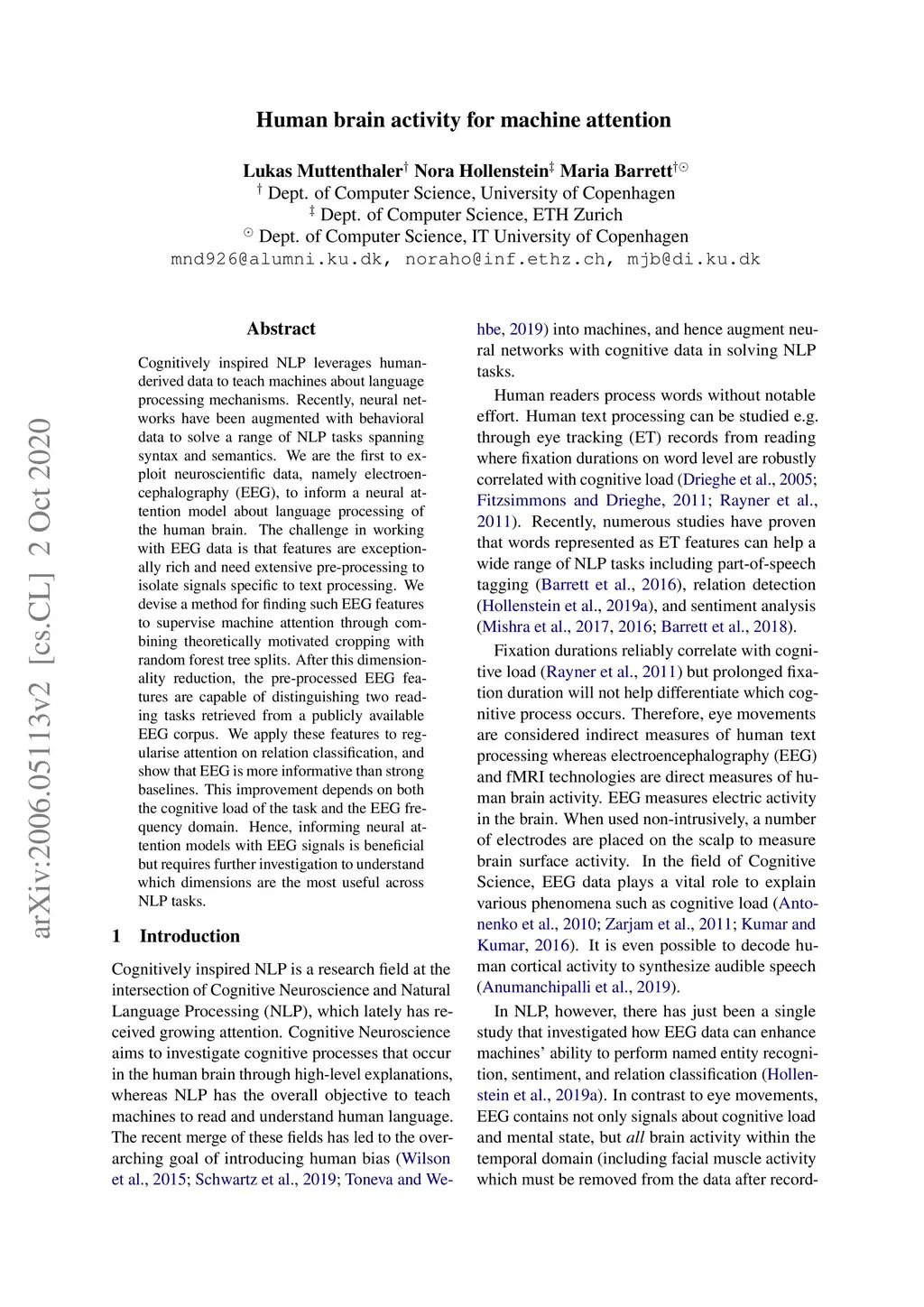 Cognitively inspired NLP leverages human-derived data to teach machines about language processing mechanisms. Recently, neural networks have been augmented with behavioral data to solve a range of NLP tasks spanning syntax and semantics. We are the first to exploit neuroscientific data, namely electroencephalography (EEG), to inform a neural attention model about language processing of the human brain. The challenge in working with EEG data is that features are exceptionally rich and need extensive pre-processing to isolate signals specific to text processing. We devise a method for finding such EEG features to supervise machine attention through combining theoretically motivated cropping with random forest tree splits. After this dimensionality reduction, the pre-processed EEG features are capable of distinguishing two reading tasks retrieved from a publicly available EEG corpus. We apply these features to regularise attention on relation classification and show that EEG is more informative than strong baselines. This improvement depends on both the cognitive load of the task and the EEG frequency domain. Hence, informing neural attention models with EEG signals is beneficial but requires further investigation to understand which dimensions are the most useful across NLP tasks.
