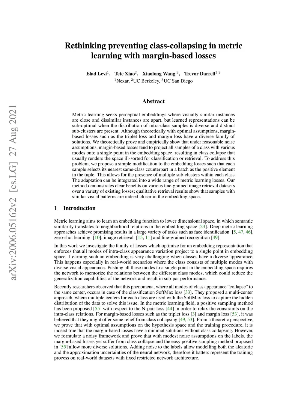 Metric learning seeks perceptual embeddings where visually similar instances are close and dissimilar instances are apart, but learned representations can be sub-optimal when the distribution of intra-class samples is diverse and distinct sub-clusters are present. Although theoretically with optimal assumptions, margin-based losses such as the triplet loss and margin loss have a diverse family of solutions. We theoretically prove and empirically show that under reasonable noise assumptions, margin-based losses tend to project all samples of a class with various modes onto a single point in the embedding space, resulting in a class collapse that usually renders the space ill-sorted for classification or retrieval. To address this problem, we propose a simple modification to the embedding losses such that each sample selects its nearest same-class counterpart in a batch as the positive element in the tuple. This allows for the presence of multiple sub-clusters within each class. The adaptation can be integrated into a wide range of metric learning losses. The proposed sampling method demonstrates clear benefits on various fine-grained image retrieval datasets over a variety of existing losses; qualitative retrieval results show that samples with similar visual patterns are indeed closer in the embedding space.