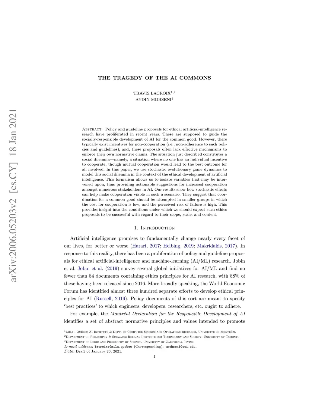 Policy and guideline proposals for ethical artificial-intelligence research have proliferated in recent years. These are supposed to guide the socially-responsible development of AI for the common good. However, there typically exist incentives for non-cooperation (i.e., non-adherence to such policies and guidelines); and, these proposals often lack effective mechanisms to enforce their own normative claims. The situation just described constitutes a social dilemma; namely, a situation where no one has an individual incentive to cooperate, though mutual cooperation would lead to the best outcome for all involved. In this paper, we use stochastic evolutionary game dynamics to model this social dilemma in the context of the ethical development of artificial intelligence. This formalism allows us to isolate variables that may be intervened upon, thus providing actionable suggestions for increased cooperation amongst numerous stakeholders in AI. Our results show how stochastic effects can help make cooperation viable in such a scenario. They suggest that coordination for a common good should be attempted in smaller groups in which the cost for cooperation is low, and the perceived risk of failure is high. This provides insight into the conditions under which we should expect such ethics proposals to be successful with regard to their scope, scale, and content.
