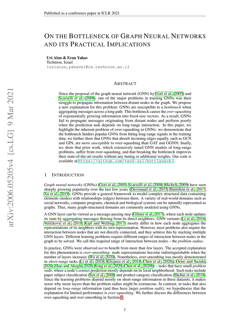 Since the proposal of the graph neural network (GNN) by Gori et al. (2005) and Scarselli et al. (2008), one of the major problems in training GNNs was their struggle to propagate information between distant nodes in the graph. We propose a new explanation for this problem: GNNs are susceptible to a bottleneck when aggregating messages across a long path. This bottleneck causes the over-squashing of exponentially growing information into fixed-size vectors. As a result, GNNs fail to propagate messages originating from distant nodes and perform poorly when the prediction task depends on long-range interaction. In this paper, we highlight the inherent problem of over-squashing in GNNs: we demonstrate that the bottleneck hinders popular GNNs from fitting long-range signals in the training data; we further show that GNNs that absorb incoming edges equally, such as GCN and GIN, are more susceptible to over-squashing than GAT and GGNN; finally, we show that prior work, which extensively tuned GNN models of long-range problems, suffers from over-squashing, and that breaking the bottleneck improves their state-of-the-art results without any tuning or additional weights. Our code is available at https://github.com/tech-srl/bottleneck/ .