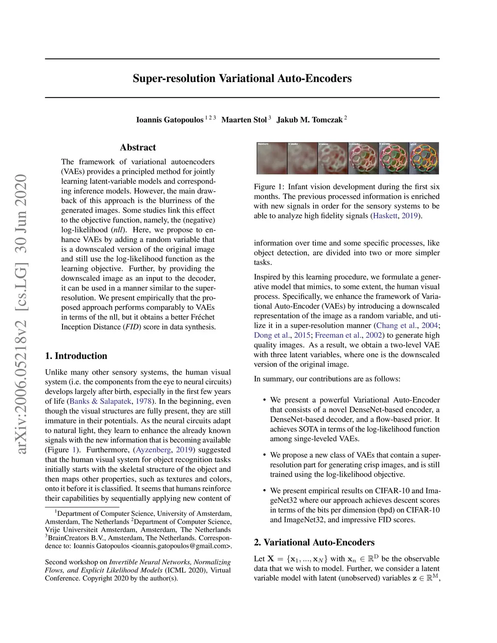 The framework of variational autoencoders (VAEs) provides a principled method for jointly learning latent-variable models and corresponding inference models. However, the main drawback of this approach is the blurriness of the generated images. Some studies link this effect to the objective function, namely, the (negative) log-likelihood. Here, we propose to enhance VAEs by adding a random variable that is a downscaled version of the original image and still use the log-likelihood function as the learning objective. Further, by providing the downscaled image as an input to the decoder, it can be used in a manner similar to the super-resolution. We present empirically that the proposed approach performs comparably to VAEs in terms of the negative log-likelihood, but it obtains a better FID score in data synthesis.