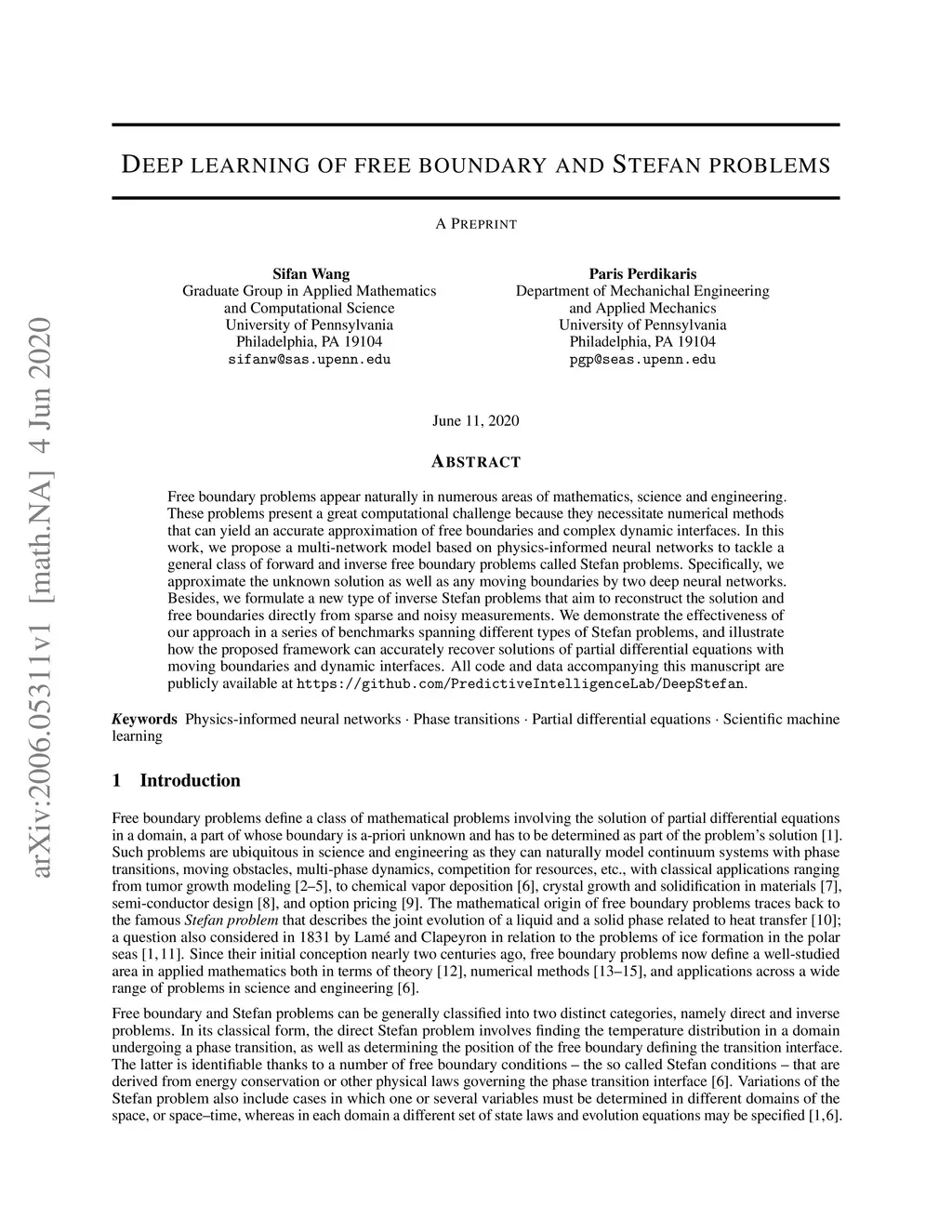 Free boundary problems appear naturally in numerous areas of mathematics, science and engineering. These problems present a great computational challenge because they necessitate numerical methods that can yield an accurate approximation of free boundaries and complex dynamic interfaces. In this work, we propose a multi-network model based on physics-informed neural networks to tackle a general class of forward and inverse free boundary problems called Stefan problems. Specifically, we approximate the unknown solution as well as any moving boundaries by two deep neural networks. Besides, we formulate a new type of inverse Stefan problems that aim to reconstruct the solution and free boundaries directly from sparse and noisy measurements. We demonstrate the effectiveness of our approach in a series of benchmarks spanning different types of Stefan problems, and illustrate how the proposed framework can accurately recover solutions of partial differential equations with moving boundaries and dynamic interfaces. All code and data accompanying this manuscript are publicly available at \url{https://github.com/PredictiveIntelligenceLab/DeepStefan}.