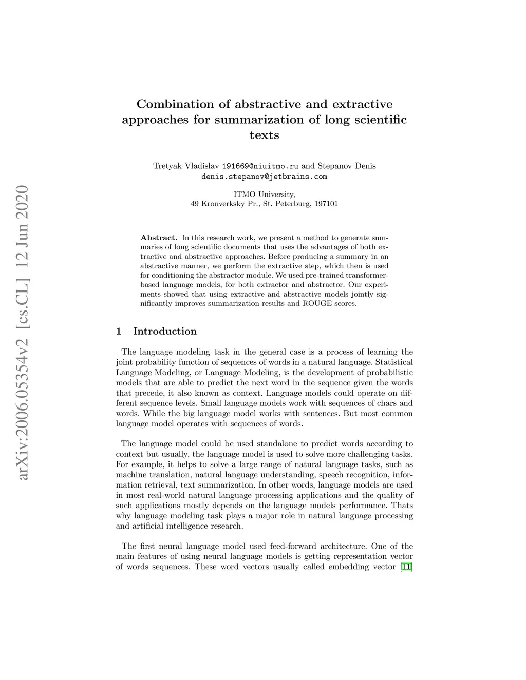 In this research work, we present a method to generate summaries of long scientific documents that uses the advantages of both extractive and abstractive approaches. Before producing a summary in an abstractive manner, we perform the extractive step, which then is used for conditioning the abstractor module. We used pre-trained transformer-based language models, for both extractor and abstractor. Our experiments showed that using extractive and abstractive models jointly significantly improves summarization results and ROUGE scores.