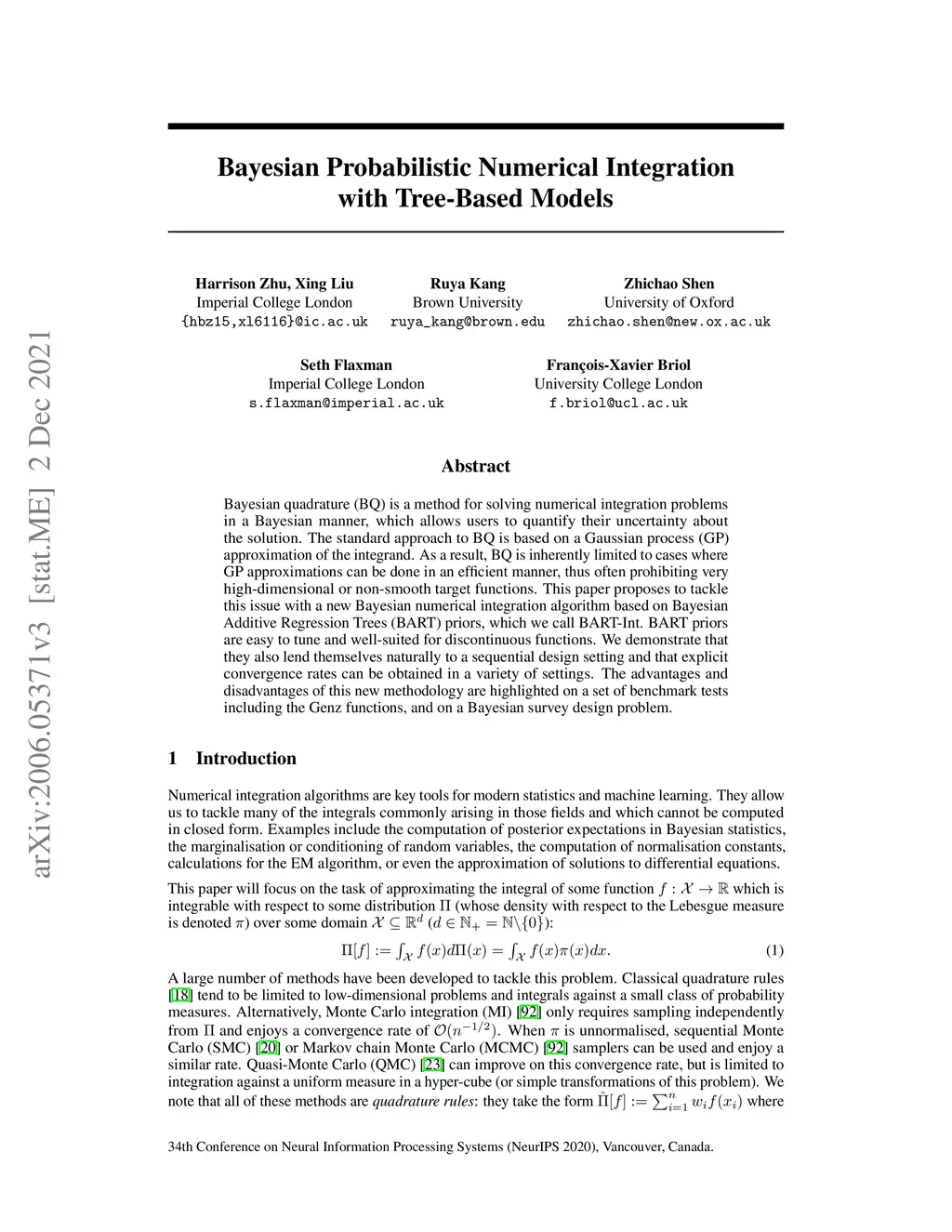 Bayesian quadrature (BQ) is a method for solving numerical integration problems in a Bayesian manner, which allows users to quantify their uncertainty about the solution. The standard approach to BQ is based on a Gaussian process (GP) approximation of the integrand. As a result, BQ is inherently limited to cases where GP approximations can be done in an efficient manner, thus often prohibiting very high-dimensional or non-smooth target functions. This paper proposes to tackle this issue with a new Bayesian numerical integration algorithm based on Bayesian Additive Regression Trees (BART) priors, which we call BART-Int. BART priors are easy to tune and well-suited for discontinuous functions. We demonstrate that they also lend themselves naturally to a sequential design setting and that explicit convergence rates can be obtained in a variety of settings. The advantages and disadvantages of this new methodology are highlighted on a set of benchmark tests including the Genz functions, and on a Bayesian survey design problem.