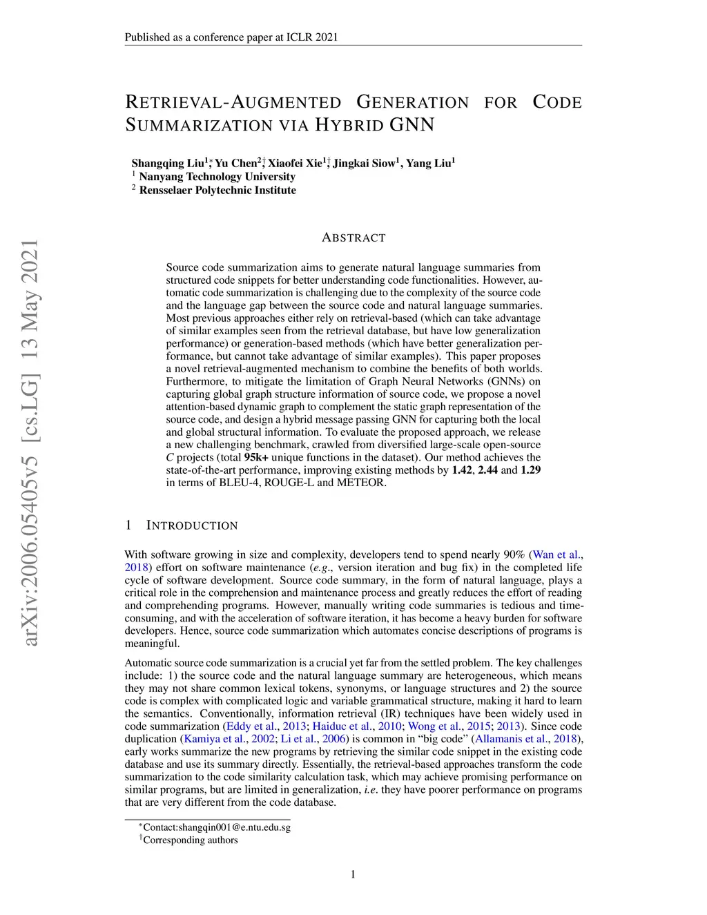 Retrieval-Augmented Generation for Code Summarization via Hybrid GNN