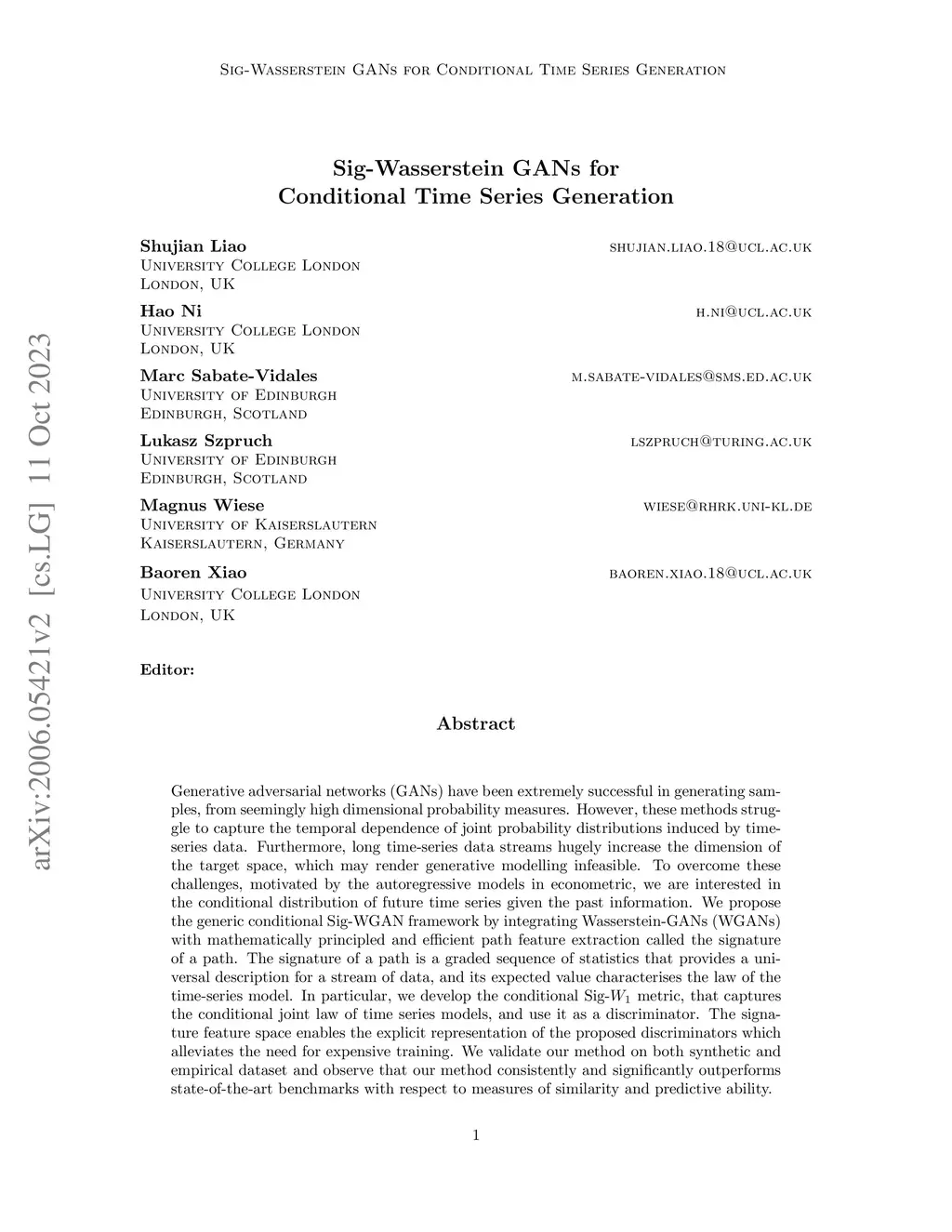 Generative adversarial networks (GANs) have been extremely successful in generating samples, from seemingly high dimensional probability measures. However, these methods struggle to capture the temporal dependence of joint probability distributions induced by time-series data. Furthermore, long time-series data streams hugely increase the dimension of the target space, which may render generative modelling infeasible. To overcome these challenges, motivated by the autoregressive models in econometric, we are interested in the conditional distribution of future time series given the past information. We propose the generic conditional Sig-WGAN framework by integrating Wasserstein-GANs (WGANs) with mathematically principled and efficient path feature extraction called the signature of a path. The signature of a path is a graded sequence of statistics that provides a universal description for a stream of data, and its expected value characterises the law of the time-series model. In particular, we develop the conditional Sig- metric, that captures the conditional joint law of time series models, and use it as a discriminator. The signature feature space enables the explicit representation of the proposed discriminators which alleviates the need for expensive training. We validate our method on both synthetic and empirical dataset and observe that our method consistently and significantly outperforms state-of-the-art benchmarks with respect to measures of similarity and predictive ability.