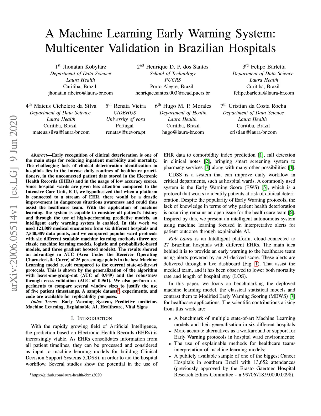 Early recognition of clinical deterioration is one of the main steps for reducing inpatient morbidity and mortality. The challenging task of clinical deterioration identification in hospitals lies in the intense daily routines of healthcare practitioners, in the unconnected patient data stored in the Electronic Health Records (EHRs) and in the usage of low accuracy scores. Since hospital wards are given less attention compared to the Intensive Care Unit, ICU, we hypothesized that when a platform is connected to a stream of EHR, there would be a drastic improvement in dangerous situations awareness and could thus assist the healthcare team. With the application of machine learning, the system is capable to consider all patient's history and through the use of high-performing predictive models, an intelligent early warning system is enabled. In this work we used 121,089 medical encounters from six different hospitals and 7,540,389 data points, and we compared popular ward protocols with six different scalable machine learning methods (three are classic machine learning models, logistic and probabilistic-based models, and three gradient boosted models). The results showed an advantage in AUC (Area Under the Receiver Operating Characteristic Curve) of 25 percentage points in the best Machine Learning model result compared to the current state-of-the-art protocols. This is shown by the generalization of the algorithm with leave-one-group-out (AUC of 0.949) and the robustness through cross-validation (AUC of 0.961). We also perform experiments to compare several window sizes to justify the use of five patient timestamps. A sample dataset, experiments, and code are available for replicability purposes.