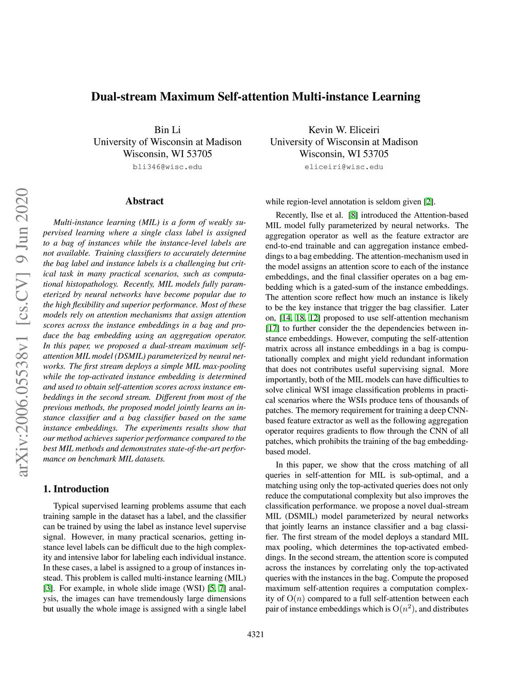 Multi-instance learning (MIL) is a form of weakly supervised learning where a single class label is assigned to a bag of instances while the instance-level labels are not available. Training classifiers to accurately determine the bag label and instance labels is a challenging but critical task in many practical scenarios, such as computational histopathology. Recently, MIL models fully parameterized by neural networks have become popular due to the high flexibility and superior performance. Most of these models rely on attention mechanisms that assign attention scores across the instance embeddings in a bag and produce the bag embedding using an aggregation operator. In this paper, we proposed a dual-stream maximum self-attention MIL model (DSMIL) parameterized by neural networks. The first stream deploys a simple MIL max-pooling while the top-activated instance embedding is determined and used to obtain self-attention scores across instance embeddings in the second stream. Different from most of the previous methods, the proposed model jointly learns an instance classifier and a bag classifier based on the same instance embeddings. The experiments results show that our method achieves superior performance compared to the best MIL methods and demonstrates state-of-the-art performance on benchmark MIL datasets.