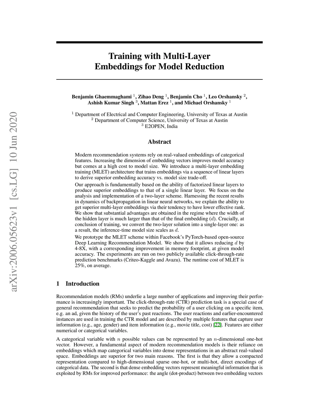 Modern recommendation systems rely on real-valued embeddings of categorical features. Increasing the dimension of embedding vectors improves model accuracy but comes at a high cost to model size. We introduce a multi-layer embedding training (MLET) architecture that trains embeddings via a sequence of linear layers to derive superior embedding accuracy vs. model size trade-off. Our approach is fundamentally based on the ability of factorized linear layers to produce superior embeddings to that of a single linear layer. We focus on the analysis and implementation of a two-layer scheme. Harnessing the recent results in dynamics of backpropagation in linear neural networks, we explain the ability to get superior multi-layer embeddings via their tendency to have lower effective rank. We show that substantial advantages are obtained in the regime where the width of the hidden layer is much larger than that of the final embedding (d). Crucially, at conclusion of training, we convert the two-layer solution into a single-layer one: as a result, the inference-time model size scales as d. We prototype the MLET scheme within Facebook's PyTorch-based open-source Deep Learning Recommendation Model. We show that it allows reducing d by 4-8X, with a corresponding improvement in memory footprint, at given model accuracy. The experiments are run on two publicly available click-through-rate prediction benchmarks (Criteo-Kaggle and Avazu). The runtime cost of MLET is 25%, on average.
